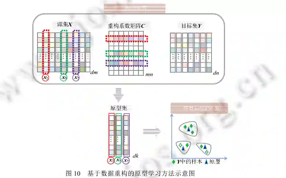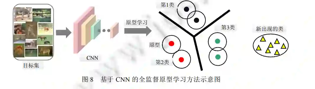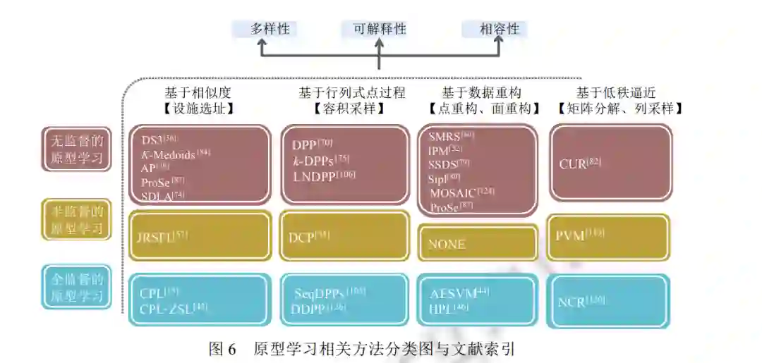 图6 利用现有文献举例阐述了原型学习的 3 种监督方式和 4 类原型学习模型. 从中发现: 除基于数据重 构的原型学习模型之外, 基于相似度、行列式点过程以及低秩逼近的三大类原型学习模型均能在不同的监督 方式下工作. 原因在于: 现有的基于数据重构的原型学习方法还未充分考虑如何有效利用少量数据的语义信 息, 来进一步提高原型的代表性.