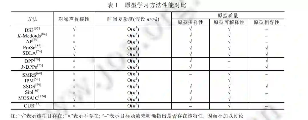 本文通过对现有文献的梳理和总结, 分别从原型学习的监督方式与模型设计两个层面, 介绍了已有的原 型学习方法. 目前, 原型学习方法依据监督方式可以分为无监督、半监督和全监督原型学习. 其中, 无监督场景最为常 见, 而半监督研究成果最为稀少. 然而, 由于语义信息的约束, 全监督下学习的原型具有更强的判别性, 而无 监督学习出的原型由于充分挖掘出目标集的分布与结构信息, 因此具有更强的代表性. 另外, 依据模型设计 的目标, 现有的原型学习方法主要有基于相似度/非相似度、行列式点过程、数据重构和低秩逼近的原型学习 这 4 种. 其中, 基于数据重构的原型学习对服从子空间分布的目标集更有效; 而基于相似度/非相似度的原型 学习虽然不限制数据特质, 但是需要事先提供一个极具判别力的度量空间; 基于行列式点过程的原型学习方 法能够利用行列式约束原型的多样性, 但是优化目标单一, 忽略了原型的可解释性等其他质量指标; 最后, 基于低秩逼近的原型学习原理最为直观, 同时也容易实现, 但是关于矩阵运算的复杂度在一定程度上限制了 该类方法在大规模数据集上的实施. 表 1 选取了无监督下常用的四大类原型学习方法作为对比参考, 因为其 他监督方式下的代表性方法较少, 所以在此不多加讨论. 由表1可以看出, 目前绝大部分原型学习方法都没有 灵活应对噪声的能力. 此外, 在原型学习时引入的约束越多, 原型的质量也越高, 分类效果越好. 但同时, 该 算法的复杂度随之有所提高.