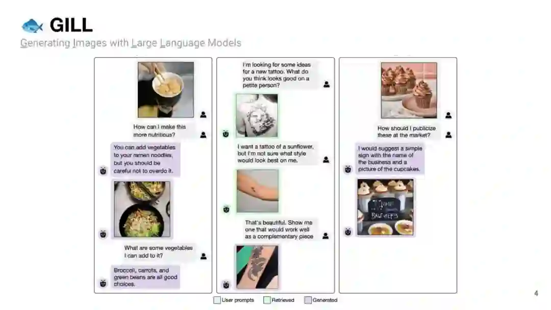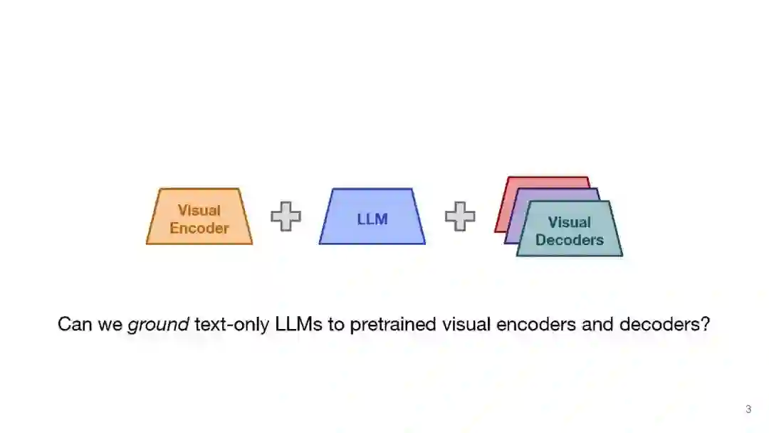 我们提出了一种方法,将冻结的仅文本大型语言模型(LLMs)与预训练的图像编码器和解码器模型融合,通过在它们的嵌入空间之间进行映射。我们的模型展示了一系列多模态功能:图像检索、新颖的图像生成和多模态对话。我们的方法是首个能够根据任意交错的图像和文本输入生成连贯的图像(和文本)输出的方法。为了在图像生成上取得强大的性能,我们提出了一个高效的映射网络,将LLM与现成的文本到图像生成模型相连接。这个映射网络将文本的隐藏表示转换为视觉模型的嵌入空间,使我们能够利用LLM的强大文本表示来进行视觉输出。我们的方法在涉及更长和更复杂语言的任务上超越了基线生成模型。除了新颖的图像生成,我们的模型还能够从预先指定的数据集中检索图像,并在推理时决定是检索还是生成。这是通过一个基于LLM的隐藏表示进行条件化的学习决策模块完成的。与之前的多模态语言模型相比,我们的模型展现了更广泛的功能。它可以处理图像和文本输入,并生成检索到的图像、生成的图像和生成的文本——在测量上下文依赖性的几项文本到图像任务中,超越了非LLM基础的生成模型。