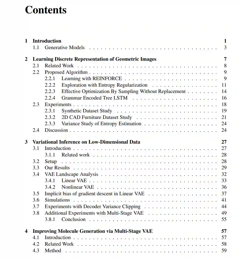 **生成模型还对程序生成和药物发现等应用带来了变革。在代码生成的基础模型中,如 Code Llama [Roziere et al., 2023] 和 AlpahCode [Li et al., 2022],现在已经能够解决竞争级别的编程问题,尽管结果并不总是可靠。在药物发现领域,机器学习的应用也取得了巨大进展。AlphaFold [Jumper et al., 2021] 可以预测蛋白质的 3D 结构,基于氨基酸序列,并且在结构预测的关键评估(CASP)竞赛中排名第一,显著超过了第二名的竞争者。DiffDock [Corso et al., 2022] 将扩散模型应用于蛋白质对接的姿态生成问题,超越了所有以前的方法,包括先前基于搜索的最先进方法。大量生成模型的应用为我们的现代世界带来了真正的技术变革。****尽管我们在过去几年取得了许多进展,但仍然面临许多挑战。例如,幻觉(hallucination)是生成模型中一个常见的问题,它表现为大型语言模型中的错误回答,在药物发现中则表现为生成的分子在自然界中不存在。如今,生成模型通常具有极大的规模,参数量达到数万亿,因此它们依赖大量优质数据。本文将探索生成建模的机制,特别是 VAE 的相关机制。本文的另一个重点是改善离散数据的生成,尤其是在分子生成和程序合成方面的直接应用。此外,我们还探讨能否利用连续数据生成方面的进展和理解来改善离散数据的生成。****生成模型的应用通常涉及生成符合特定目标的全新数据——无论是要与训练数据在属性上相似,还是要实现某些条件或无条件的目标。在本文中,我们将深入探讨帮助生成模型实现这些目标的方法。本文的两个核心主题是:i)研究当前生成模型的不足之处,它们如何影响生成质量,以及如何减轻这些影响;ii)如何通过利用领域知识,在计算约束下改善数据生成质量。**以下是本文未来章节的简要总结: