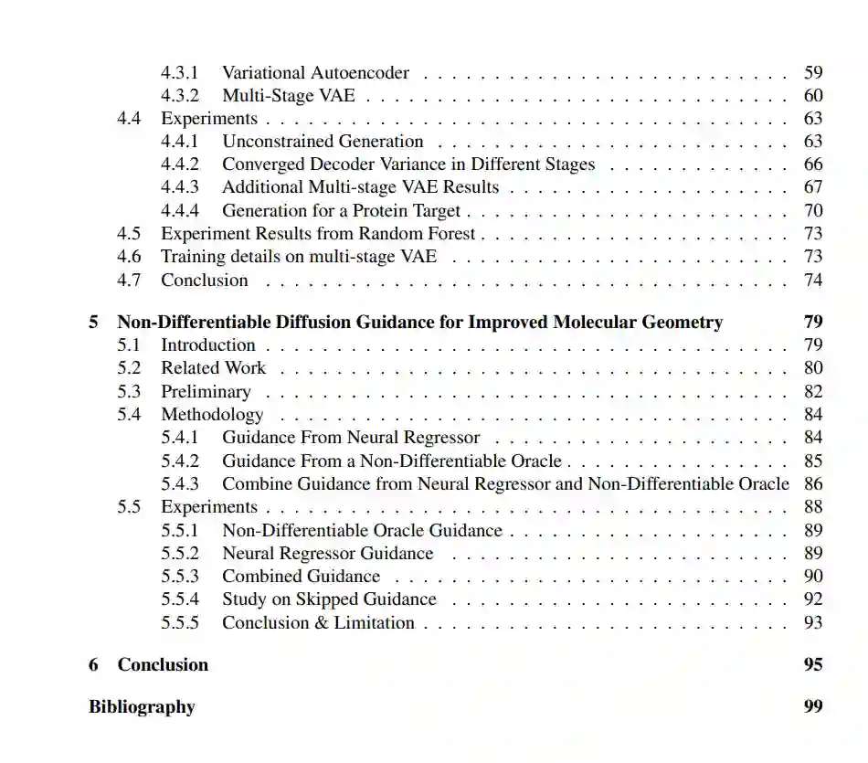 第四章(基于 Zhou 和 Poczos [2023] 的论文),我们将多阶段 VAE(已证明能改善合成数据的流形恢复)应用于分子生成任务。我们展示了在两个任务中的生成分子属性的改善:一个基于 ChEMBL 数据集 Mendez et al. [2019] 的通用生成任务,以及一个针对蛋白质靶标的生成任务,在两个小型分子数据集上进行了微调。