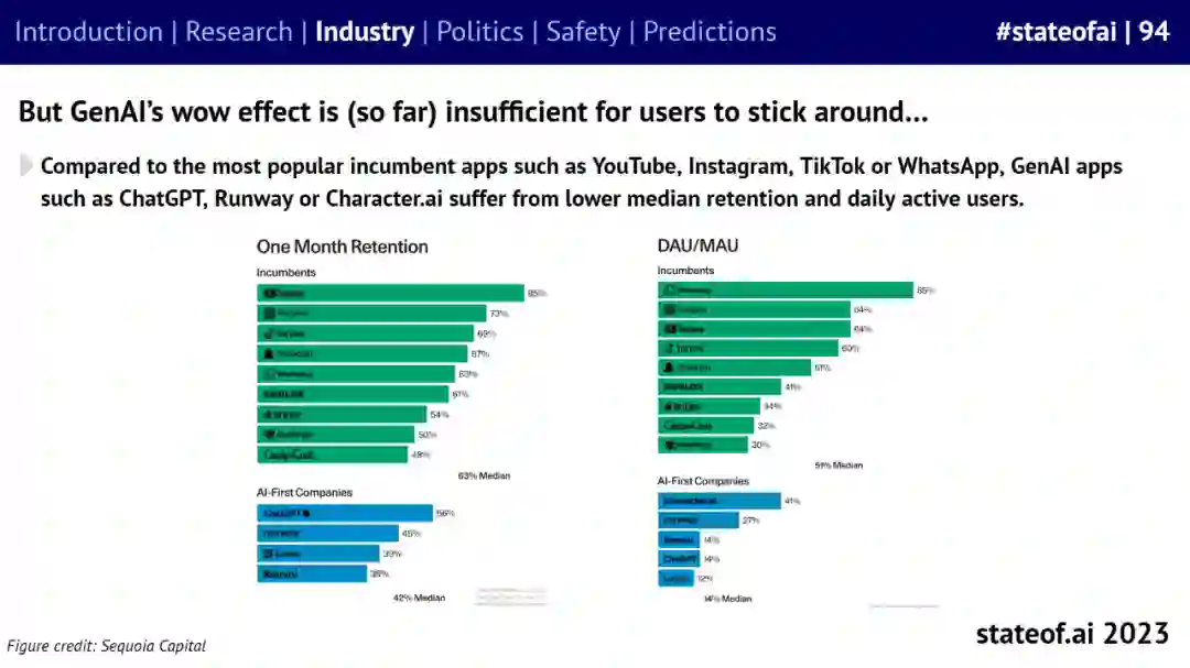 但是,与 YouTube、Instagram、TikTok 或 WhatsApp 等目前最受欢迎的应用程序相比,ChatGPT、Runway 或 Character.ai 等 GenAI 应用程序的中值留存率和每日活跃用户数较低。