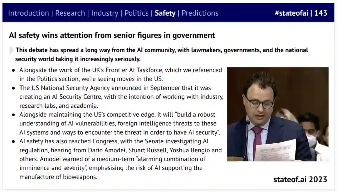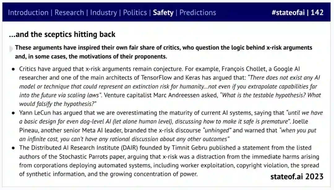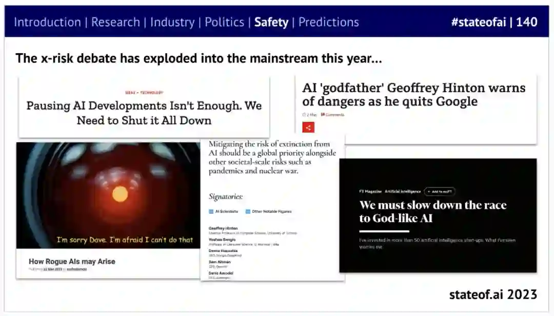 之前的 State of AI 报告曾警告称,大型实验室忽视了安全问题。2023 年,关于 AI 风险的辩论集中爆发,尤其是「灭绝风险」或灾难性风险,关于这些话题的讨论经常占据头条。