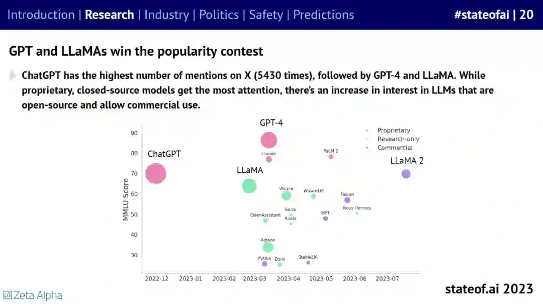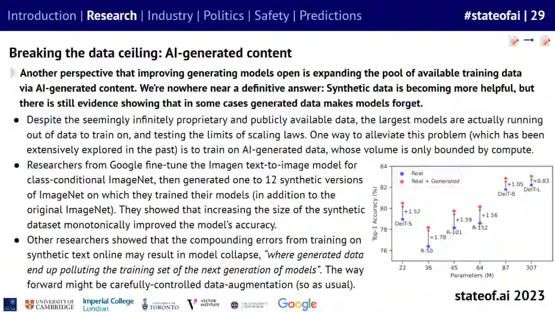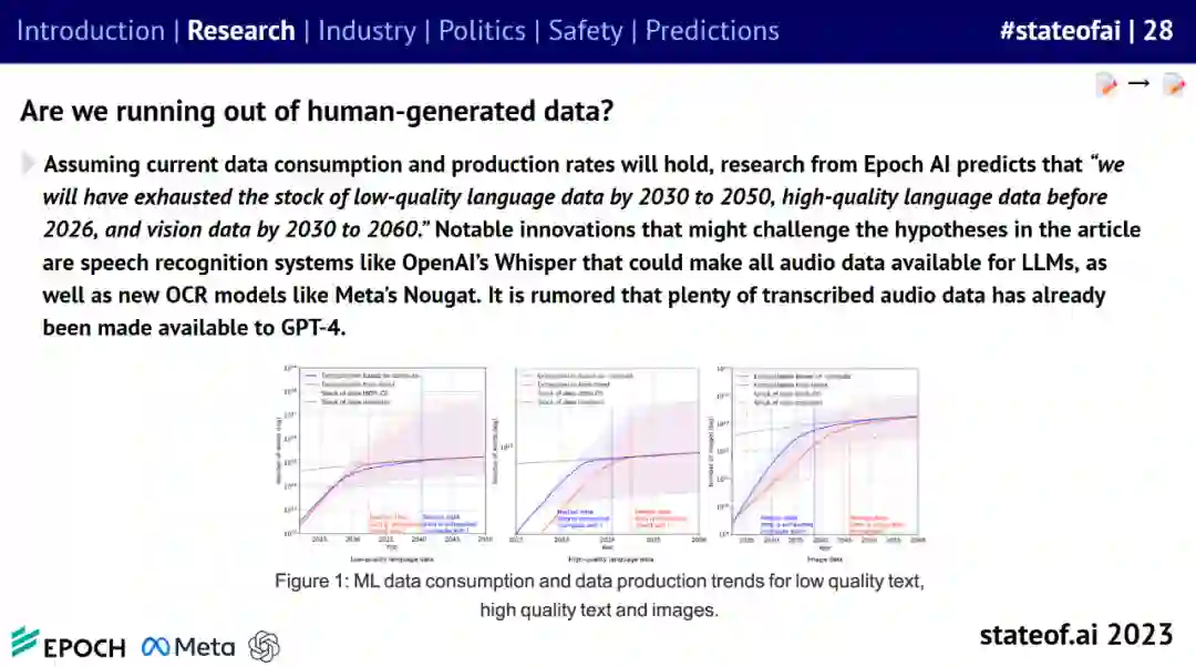 GPT-4 登场,展示了专有技术与次优开源替代方案之间的能力鸿沟,同时也验证了通过人类反馈进行强化学习的威力; * 在 LLaMa-1/2 的支持下,越来越多的人试图用更小的模型、更好的数据集、更长的上下文来克隆或击败专有模型; * 目前还不清楚人类生成的数据能维持人工智能扩展趋势多久(有人估计,到 2025 年,数据将被 LLM 耗尽),也不清楚添加合成数据会产生什么影响。企业中的视频和数据可能是下一个目标; * LLM 和扩散模型通过为分子生物学和药物发现带来新的突破,继续为生命科学界提供助力; * 多模态成为新的前沿,各种智能体热度大大增加。