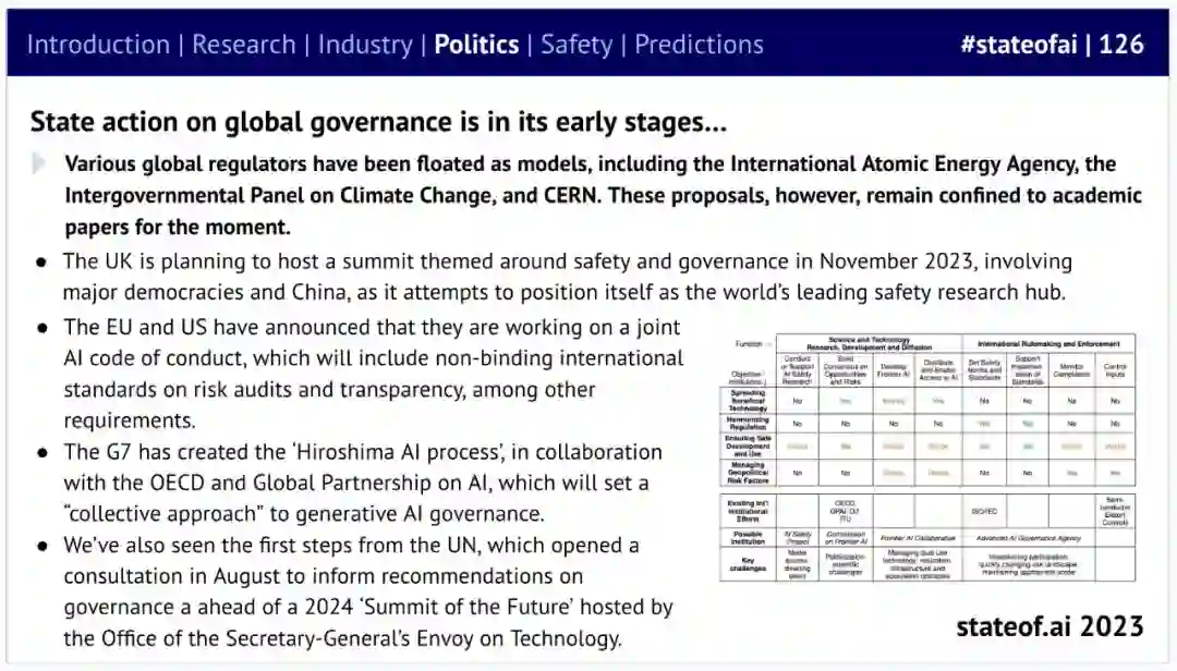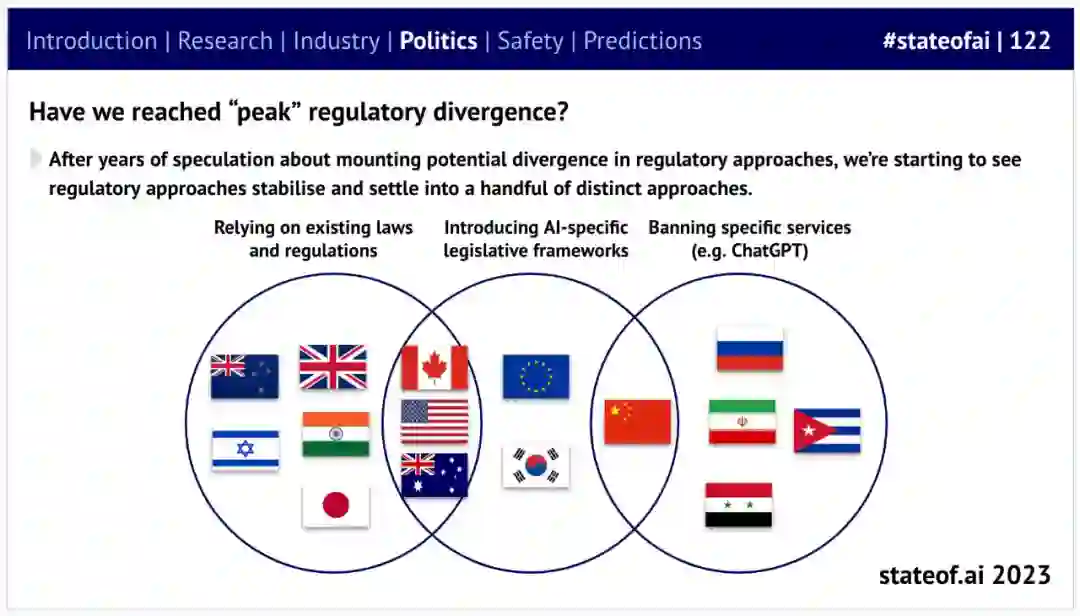 世界已划分出明确的监管阵营,但全球治理的进展仍较为缓慢,最大的人工智能实验室正在填补这一空白; * 据预测,人工智能将影响一系列敏感领域,包括选举和就业,但我们还没有看到显著的影响。