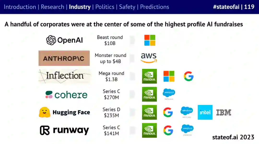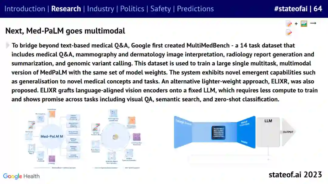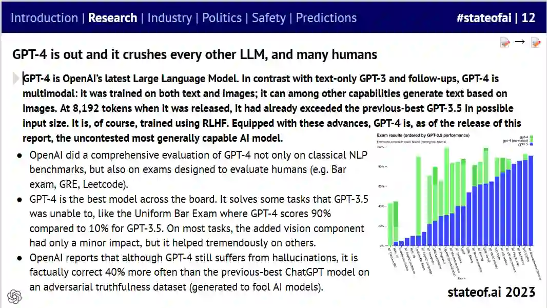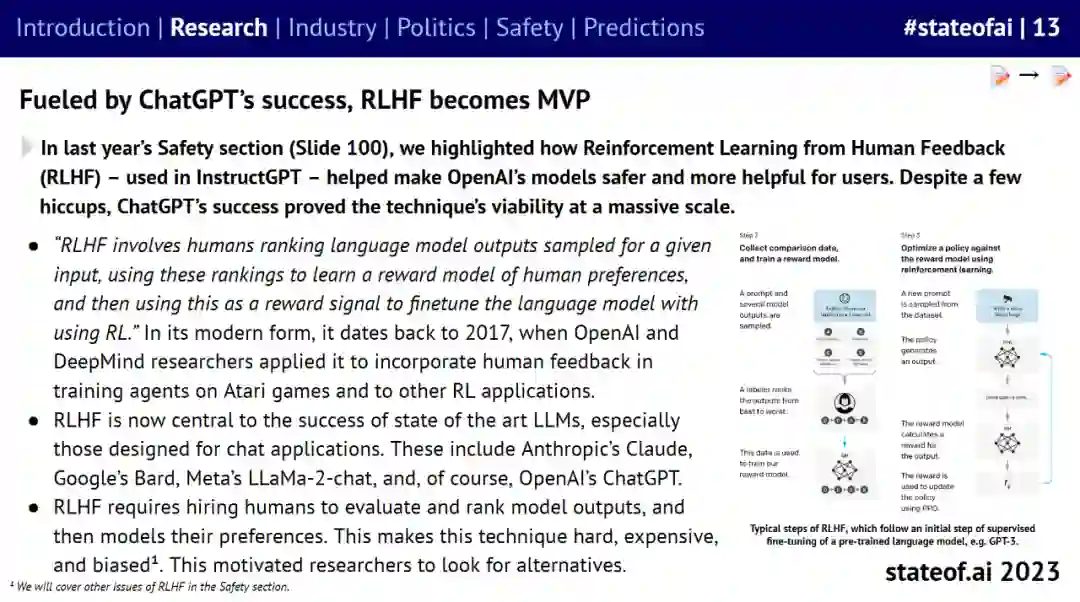 今年的报告汇总和聚焦了过去一年里 AI 行业中炙手可热的事件,援引数据来自知名科技公司和研究小组,由投资人 Nathan Benaich、Alex Chalmers、Othmane Sebbouh 和 Corina Gurau 编写。报告从研究进展、行业局势、现有政策、安全问题、未来预测五个维度出发,对最新的 AI 发展现状和未来预期进行了深度分析。