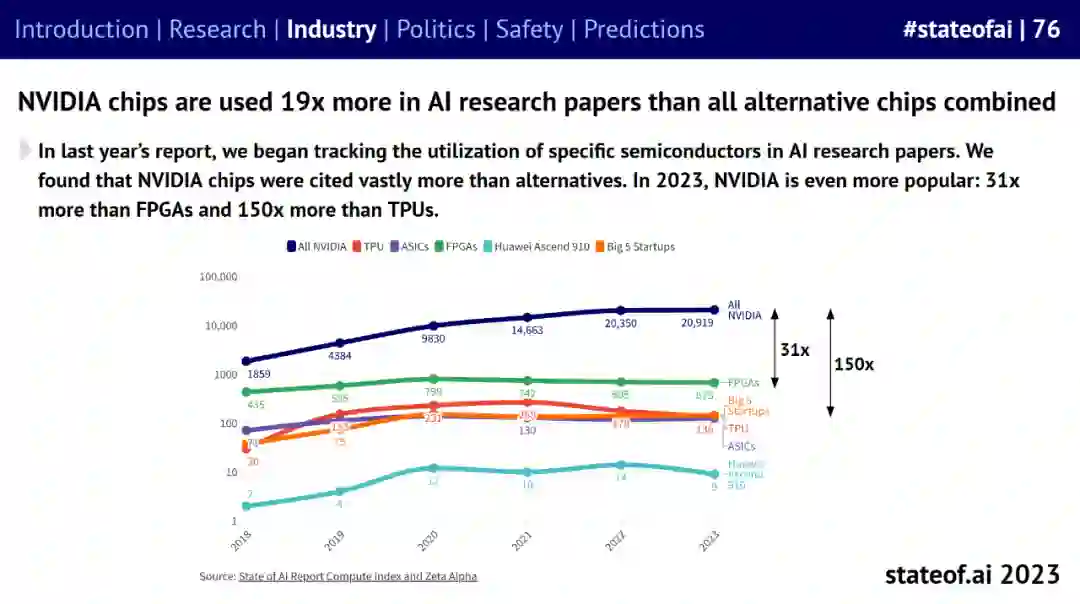 英伟达 A100、H100 GPU 集群的数量不断增加,其芯片使用量是 AI 研究论文中所有其他同类芯片总和的 19 倍。