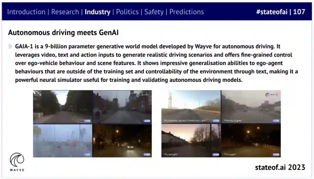 在消费软件领域之外,有迹象表明 GenAI 可以加速实体 AI 领域的进步。比如自动驾驶领域,Wayve 推出了用于生成逼真驾驶场景的 AI 大模型 GAIA-1。