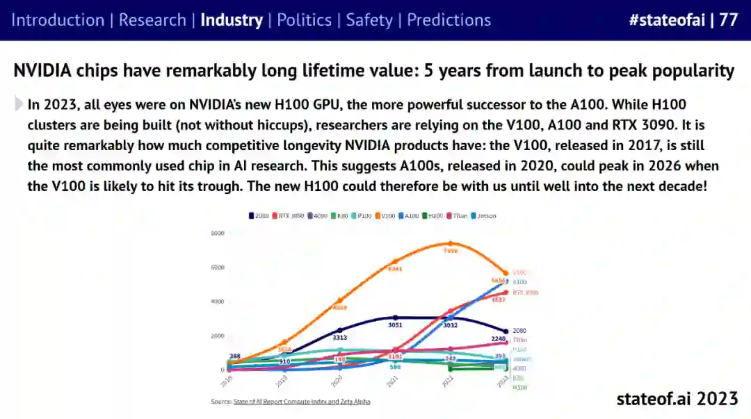 英伟达在持续推出新芯片的同时,旧 GPU 也表现出了非凡的生命周期。2017 年发布的 V100 是 2022 年 AI 研究论文中最受欢迎的 GPU。