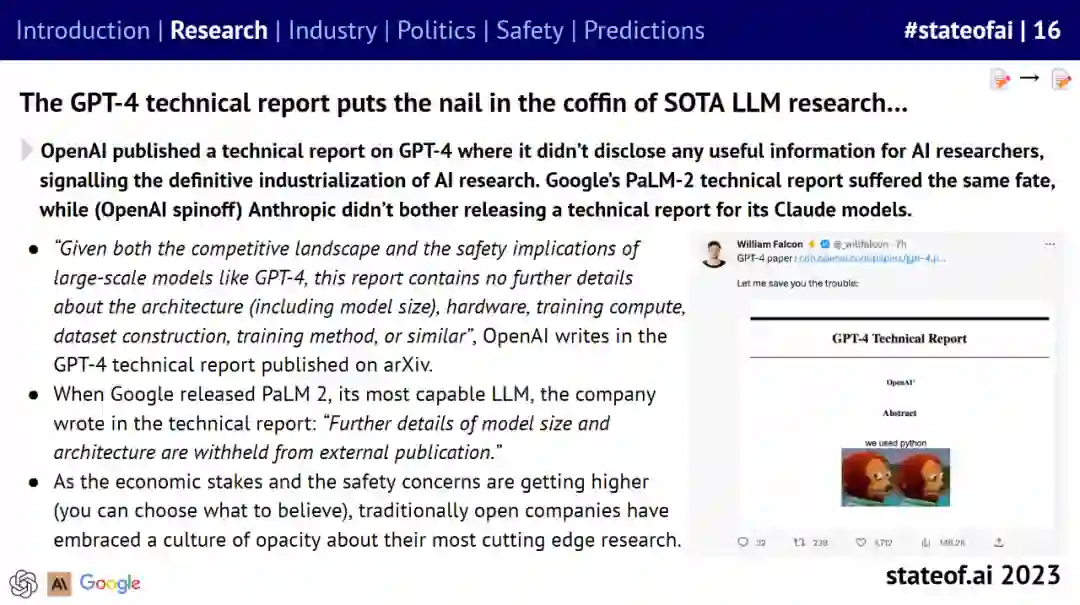 与此同时,报告认为到 2023 年,人工智能公司公开分享其最先进研究的文化将结束。报告称,OpenAI 拒绝分享有关 GPT-4 系统架构的「任何有用信息」,谷歌和 Anthropic 对他们的模型也做出了类似的决定,「随着成本升高和对安全担忧的加剧,传统上开放的科技公司已经接受了对其最前沿研究不透明的文化。」