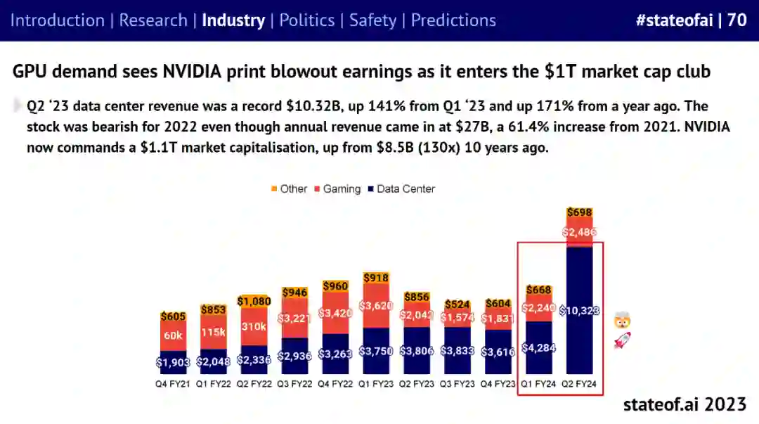AI 尤其是大模型的发展意味着现在是进入硬件行业的好时机,GPU 巨大需求见证了英伟达盈利井喷,使之进入了 1T(万亿)市值俱乐部。