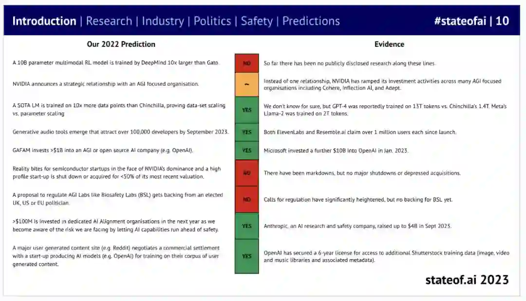 当然,这些预测并不一定完全正确。去年,他们也给出了一些预测(9 个),并在今年的报告中公布了针对这些预测的评估:其中 5 个被证明是准确的。