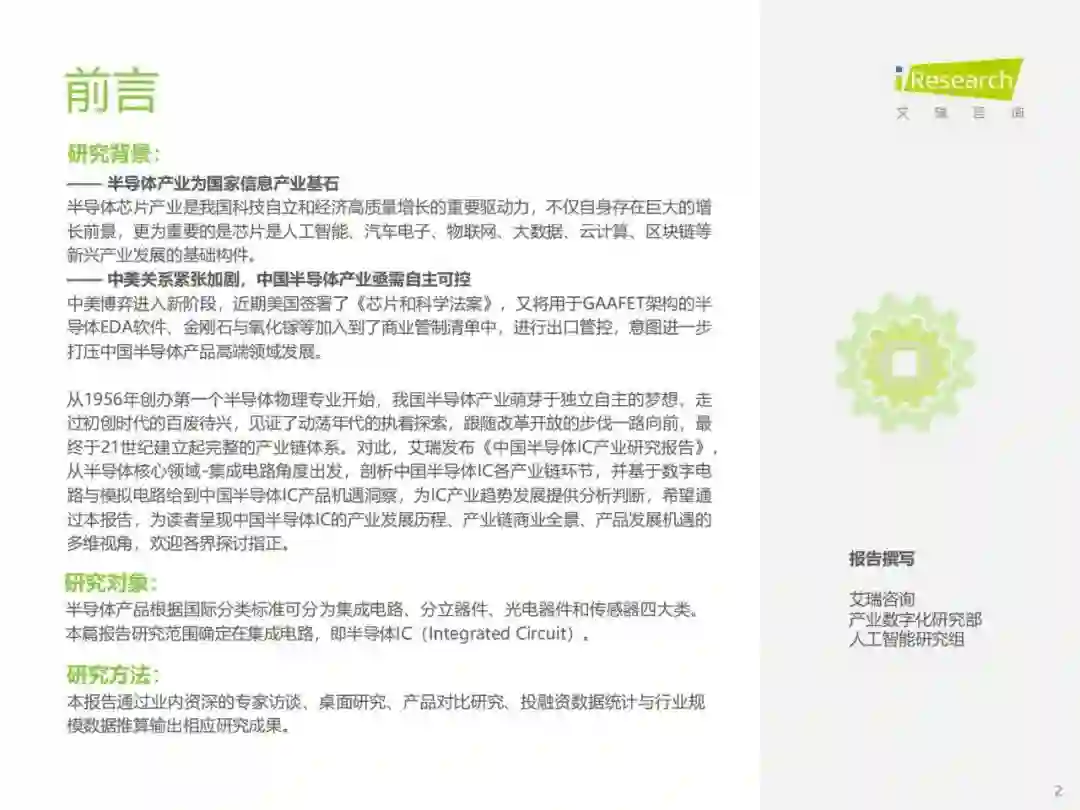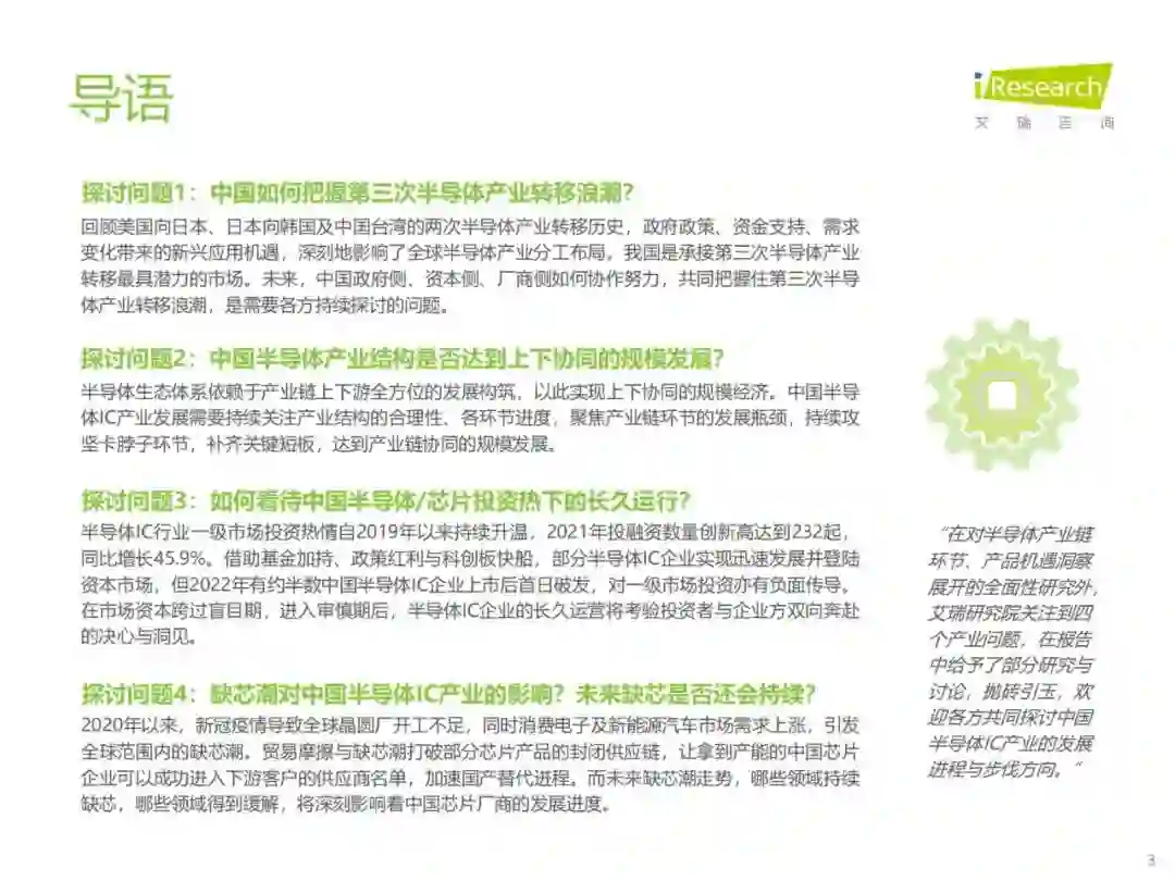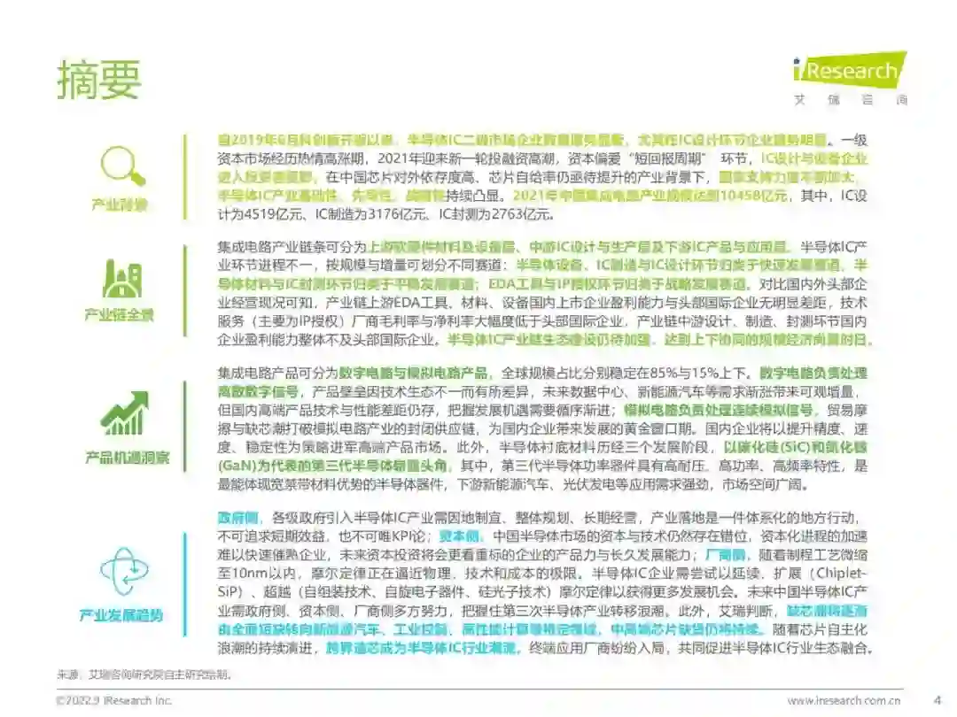 政府侧,各级政府引入半导体IC产业需因地制宜、整体规划、长期经营,产业落地是一件体系化的地方行动,不可追求短期效益,也不可唯KPI论;资本侧,中国半导体市场的资本与技术仍然存在错位,资本化进程的加速难以快速催熟企业,未来资本投资将会更看重标的企业的产品力与长久发展能力;厂商侧,随着制程工艺微缩至10nm以内,摩尔定律正在逼近物理、技术和成本的极限。半导体IC企业需尝试以延续、扩展(Chiplet-SiP)、超越(自组装技术、自旋电子器件、硅光子技术)摩尔定律以获得更多发展机会。未来中国半导体IC产业需政府侧、资本侧、厂商侧多方努力,把握住第三次半导体产业转移浪潮。此外,艾瑞判断,缺芯潮将逐渐由全面短缺转向新能源汽车、工业控制、高性能计算等特定领域,中高端芯片缺货仍将持续。随着芯片自主化浪潮的持续演进,跨界造芯成为半导体IC行业潮流,终端应用厂商纷纷入局,共同促进半导体IC行业生态融合。