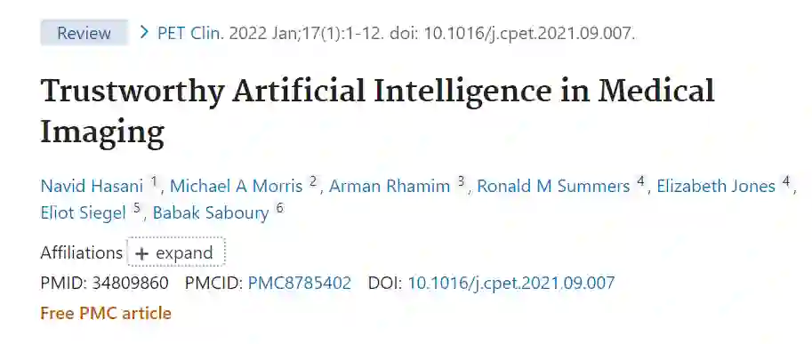 社会对人工智能(AI)的信任以及可信任的人工智能系统和生态系统的发展,对于人工智能技术在医学领域的进步和实施至关重要。随着人工智能在各种医疗和成像应用领域的应用日益广泛,使这些系统更加可靠和值得信赖变得比以往任何时候都重要。本文考虑了14个核心原则,旨在将针更接近于准确、有弹性、公平、可解释、安全和透明的系统:面向可信的AI。 https://pubmed.ncbi.nlm.nih.gov/34809860/ 问题不再是人工智能(AI)是否会影响医学的未来,而是“由谁、如何、在何处以及何时感受到这种有益或有害的影响”。基于人工智能的新技术和增强技术的发展速度正在加快,并渗透到每个行业。人工智能在改善人类生活和我们周围的环境方面有着巨大的潜力;但是,我们必须小心地向前走,以便认识到它提供的机会和避免潜在的陷阱。