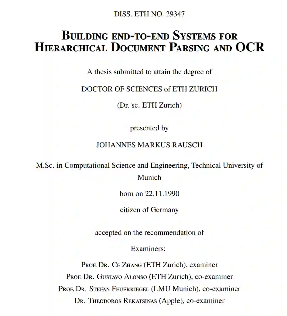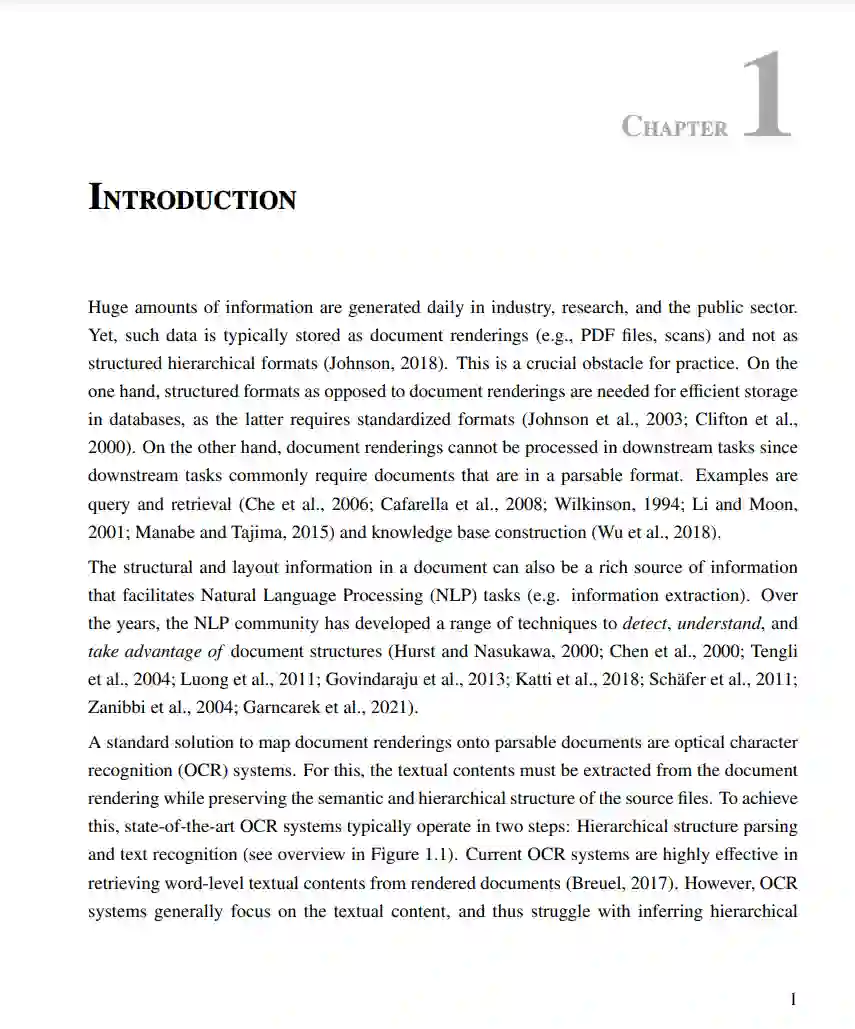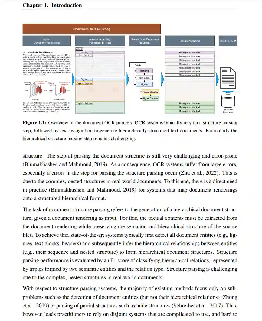 在工业、研究和公共部门,信息通常存储为已呈现的文档(例如PDF文件、扫描件)。因此,为了实现下游任务,需要系统将这些呈现的文档映射到具有层次结构的文本文档上。用于此任务的现代光学字符识别(OCR)系统通常基于解析层次文档结构和文本识别的两个单独阶段。由于一系列的挑战,之前缺少对文档完整层次结构的整体、原则性的推断方法。一个主要的挑战是由结构解析任务的复杂性给出的,该任务包括检测所有语义文档实体(例如,表格、文本和图形)以及描述它们的层次嵌套和阅读顺序的实体之间的关系。此外,系统组件中不连续的设置和使用启发式方法妨碍了在实际场景中的训练、应用和适应。另外,为基于学习的系统注解训练样本非常耗时且昂贵。在这篇论文中,我们通过构建可扩展的系统来解决这些问题,这些系统允许统一的端到端文档解析和光学字符识别。具体来说,这篇论文提供了以下贡献: