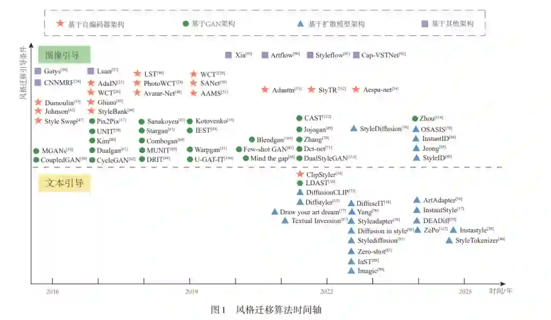 风格迁移作为图像编辑领域的一个关键研究方向,在艺术创作等领域展现出广泛的应用前景.自Gatys等人提出使用深度卷积特征间相关性捕获纹理信息并基于此实现风格迁移后,大量基于神经网络的风格迁移算法不断涌现.近年来随着各式生成模型的兴起,将生成对抗网络、扩散模型等生成模型引入风格迁移工作获得了新的关注.此外,图像-文本跨模态任务的突破使得文本引导条件下的图像风格迁移成为可能.本文对当前先进的研究方法进行分类和描述.具体地,本文依据引导条件差异,将现有方法划分为图像引导的图像风格迁移方法、文本引导的图像风格迁移方法;依据网络架构的不同,将现有方法细分为基于自编码器的方法、基于生成对抗网络的方法、基于扩散模型的方法以及基于其他模型架构的方法,对当前图像风格迁移技术的研究进行全面的综述与分析.随后,本文介绍了图像风格迁移任务的数据集和评价体系,并从定量与定性方面对部分最先进的图像风格迁移方法进行实验和比较.最后,本文讨论了当前图像风格迁移技术面临的挑战,并对未来研究方向提出了展望.