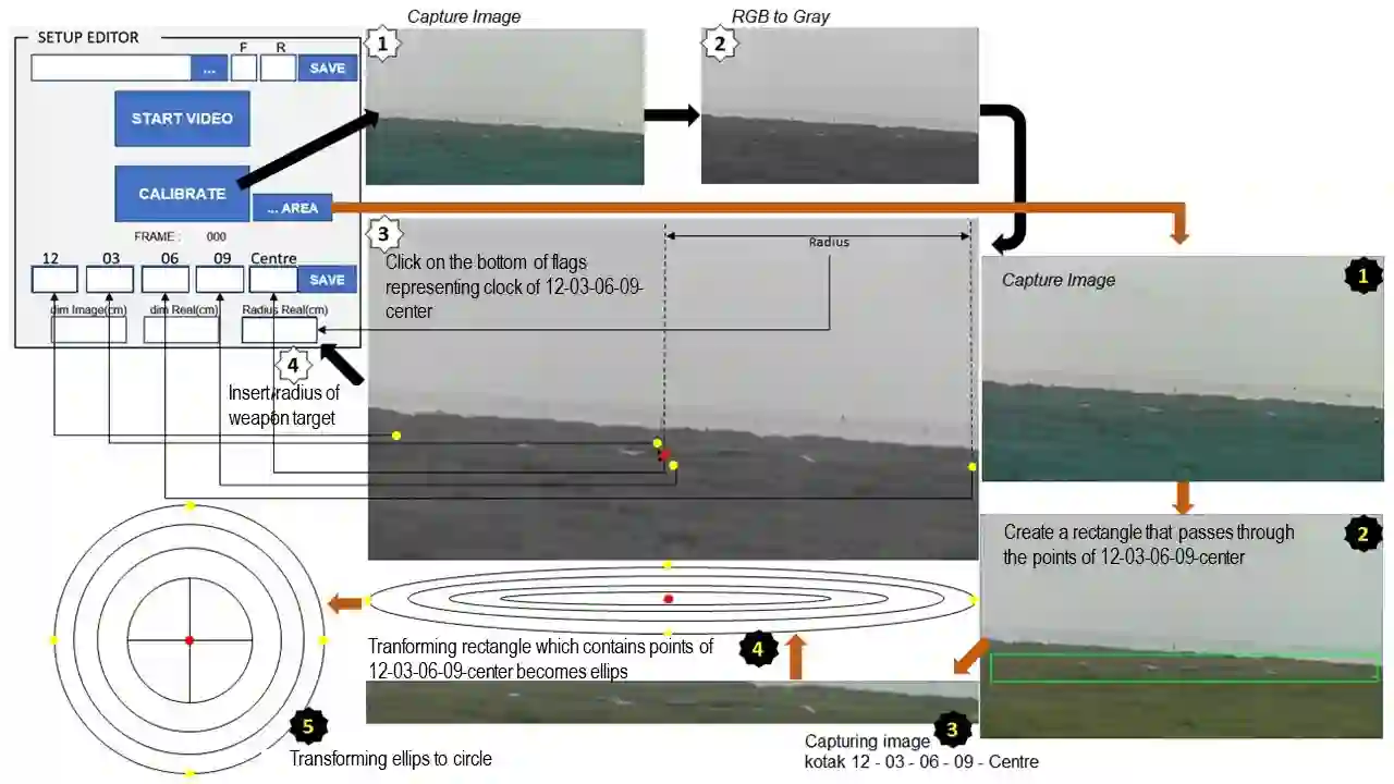 军事演习的有效性也通过部队的协调和战备状态的成功来评估。在当前的武器投射演习中,WISS系统仅检测并显示炸弹/火箭在目标上的弹着位置。该训练系统忽略了炸弹/火箭从战斗机发射时的轨迹和行为。此外,该行为对于全面理解影响作战演习成功(包括人员、飞机和武器)的所有因素至关重要。从科学角度讲,WISS无法跟踪炸弹/火箭在接近目标(因其高速)时的轨迹和角度。根据飞行员发射火箭的经验,飞机速度可达400节(205,778米/秒),火箭的初速可达600米/秒。影响这些状况的因素之一是摄像头与目标区域之间的初始校准。此外,适当的校准对于精确表示真实条件至关重要,并可作为分析和评估整体演习的基准。此评估包括弹/火箭的弹着点、武器的能力、质量和特性,以及所有相关人员的表现。然而,Wahyudi和Infantono(2017)的3D混合现实研究(建立在(Infantono et al., 2014)的3D视图几何研究基础上)并未使用校准系统来获得来自云层的准确初始数据。先前的研究提出了一种利用计算机视觉、采用顺时针椭圆校准(Clockwise-elliptical calibration)的方法来监测和评估空地射击演习(Infantono et al., 2024)。需要进一步的研究以使系统能够以接近实时的速度可视化射击过程和结果。