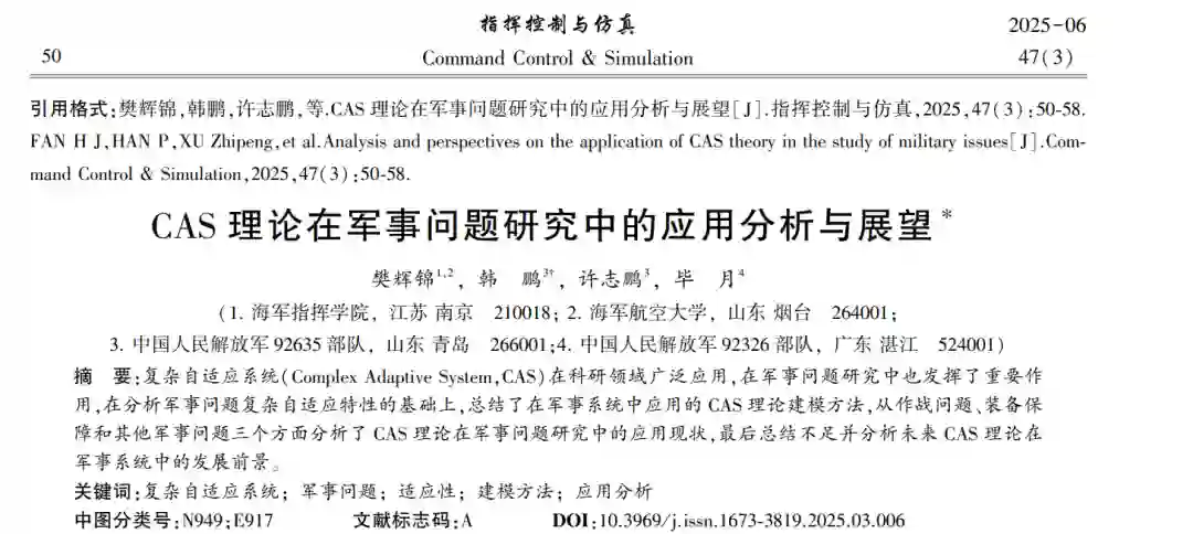 摘 要:复杂自适应系统(Complex Adaptive System,CAS)在科研领域广泛应用,在军事问题研究中也发挥了重要作 用,在分析军事问题复杂自适应特性的基础上,总结了在军事系统中应用的 CAS 理论建模方法,从作战问题、装备保 障和其他军事问题三个方面分析了 CAS 理论在军事问题研究中的应用现状,最后总结不足并分析未来 CAS 理论在 军事系统中的发展前景。 关键词:复杂自适应系统; 军事问题; 适应性; 建模方法; 应用分析