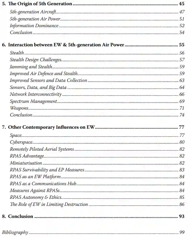 这段历史有助于了解当前和未来的发展对机载电子战的影响。第 3 章介绍了当今空中力量的作用和特点。第 4 章探讨了当今电子战及其在空中力量中的作用,最后介绍了目前影响两者的变化。第 5 章探讨了什么是第五代空军,以及这对空中力量和电子战的影响。第 6 章探讨电子战如何与第五代空中力量相互作用。第 7 章探讨了与电子战发展密切相关的其他一些主题,如太空和网络空间。本文最后就第五代空中力量中的电子战提出了建议。