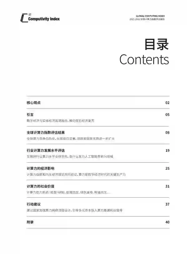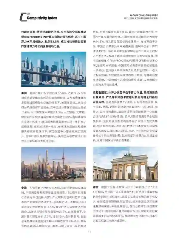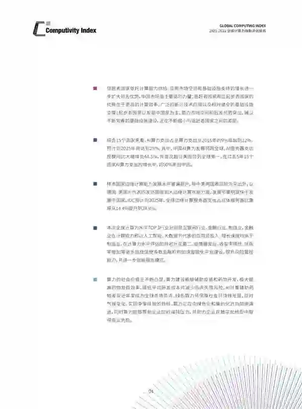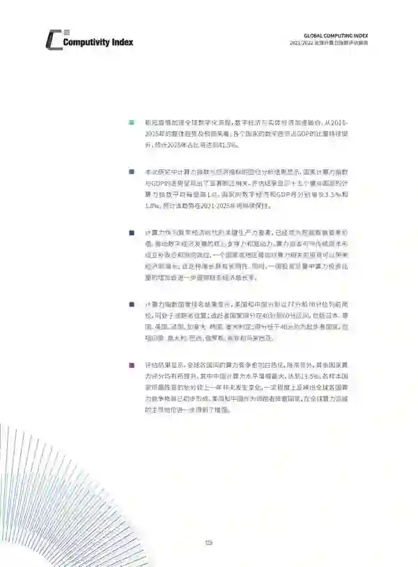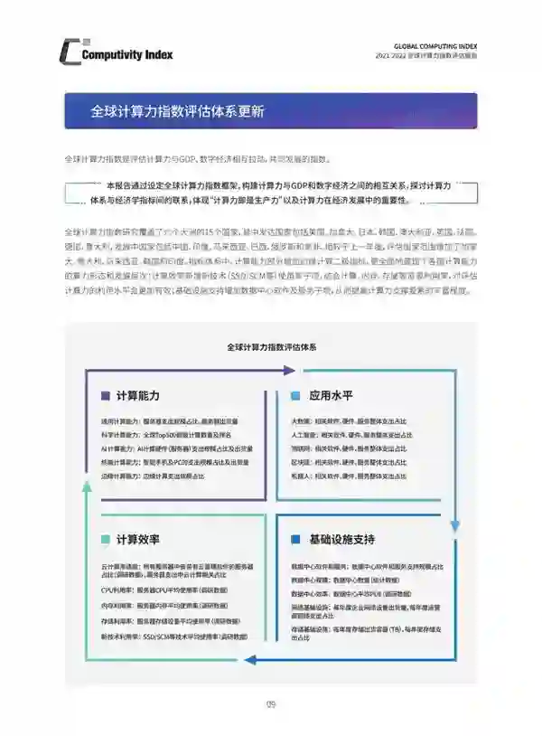 这是《全球计算力指数评估报告》第二年发布,研究范围覆盖六个大洲的15个国家,从计算能力、计算效率、应用水平和基础设施支持四个维度对各国计算力水平进行全面评估,并从统计数据角度、经济理论角度分别阐述了算力对经济增长的影响,得出十大洞察。