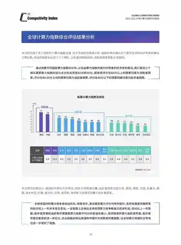 计算力指数国家排名结果显示,美国和中国分别以77分和70分位列前两位,同处于领跑者位置;追赶者国家得分在40分到60分区间,包括日本、德国、英国、法国、加拿大、韩国、澳大利亚;得分低于40分的为起步者国家,包括印度、意大利、巴西、俄罗斯、南非和马来西亚。