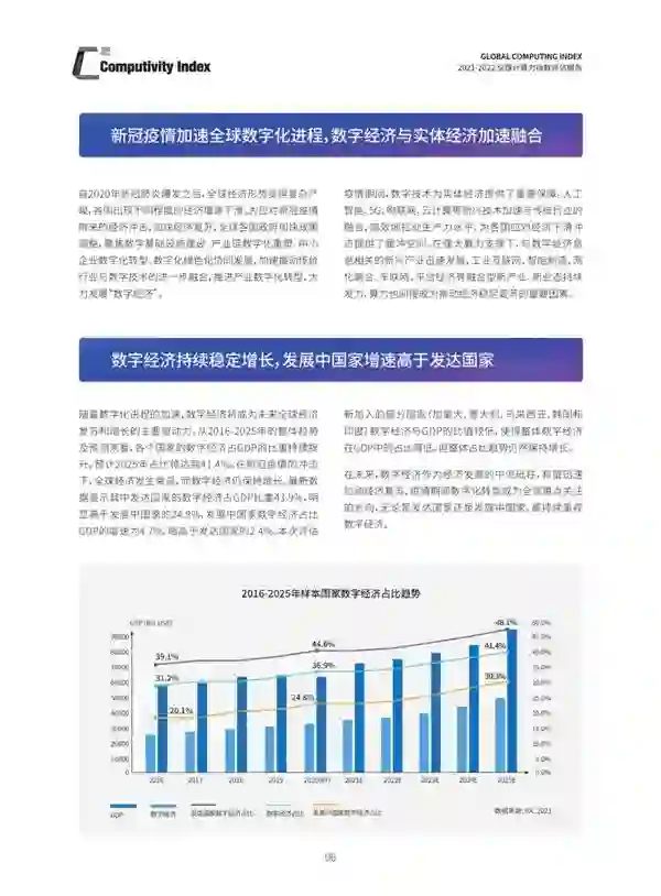 本次研究中计算力指数与经济指标的回归分析结果显示,国家计算力指数与GDP的走势呈现出了显著的正相关。评估结果显示十五个重点国家的计算力指数平均每提高1点,国家的数字经济和GDP将分别增长3.5‰和1.8‰,预计该趋势在2021-2025年将继续保持。
