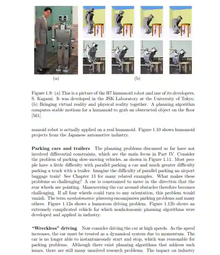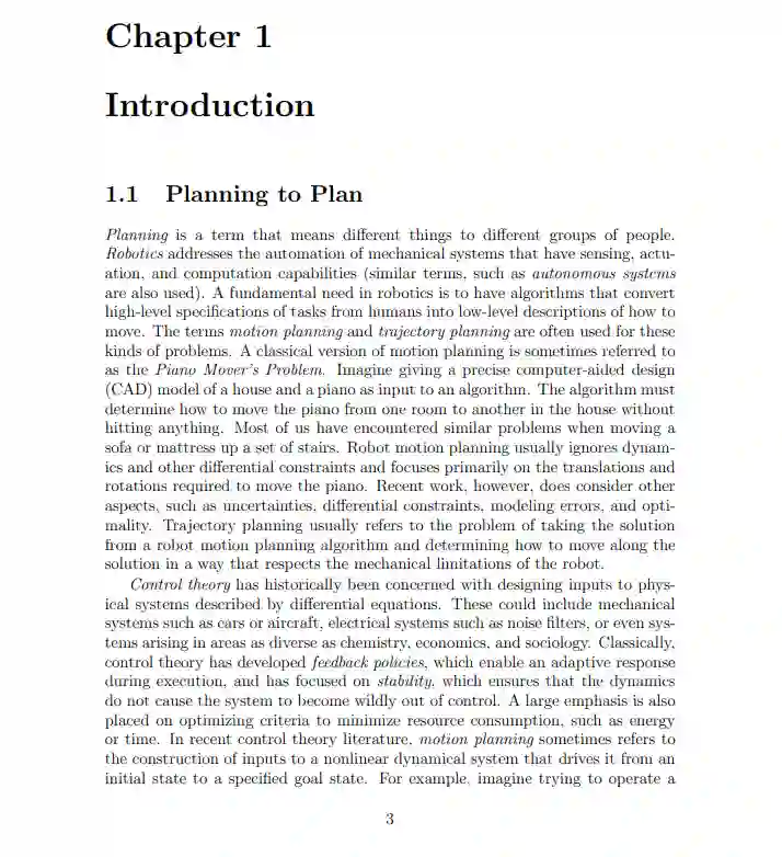 谁适合这本书? 机器人领域(robotics): 研究领域包含motion planning, trajectory planning, planning under uncertainty人工智能领域(artificial intelligence):是对机器学习的一种补充(machine planning),强化学习和决策理论都是本书涉及的范围。控制理论(control theory):反馈、最优性和动力学概念在全书的许多地方都出现了。然而,本书中的技术主要是算法,而不是通常在控制理论中开发的分析技术。