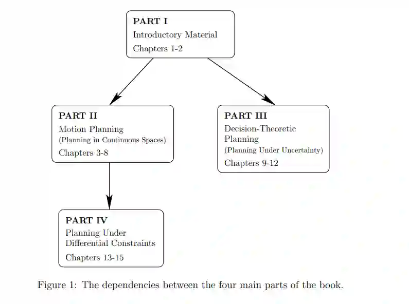 如何使用本书?若你仅对机器人运动规划感兴趣,只需学习第3-8章:第3、4章介绍了机器人运动规划的基本概念;第5、6章提出了解决系列问题的算法技巧;第7、8章研究了基础问题的一些拓展。若你对非完整规划和其他涉及到不同约束的规划问题感兴趣,可以直接跳到书的第三部分第13-15章。第11、12章关于感知的不确定性,这些问题都在信息空间(information space)内描述。