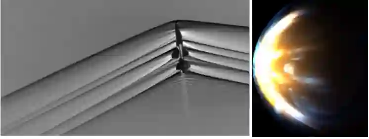 图1:左图:飞行中的超音速飞机的背景导向纹影(Background oriented schlieren)图像,展示了光学频谱中密度梯度的影响。右图:在ISL的高超声速激波风洞中,马赫数8条件下直径15厘米球体的激波加热高速图像,驻点温度高达5000 K。