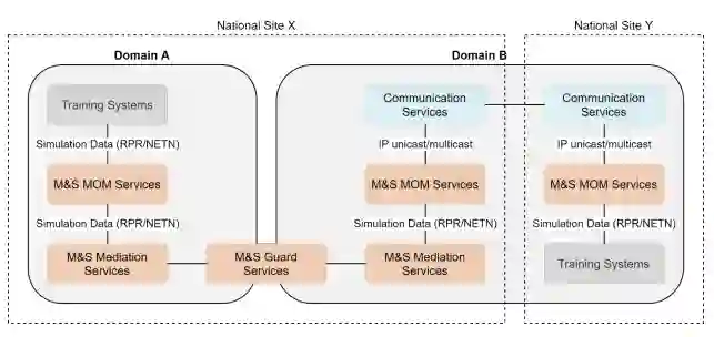 图10提供了一个跨域信息交换的简化模式。M&S调解服务将数据转换为M&S防护服务可以解释的格式。M&S调解服务和M&S防护服务之间的接口是特定的解决方案,但通常涉及XML或纯文本格式的消息,供M&S防护服务检查和过滤。M&S防护服务的实施大多是国家(机密)和专有的解决方案,并且由于与模拟数据的延迟和吞吐量有关的M&S要求,被认为是M&S特定的。训练系统位于国家站点,在这个例子中是X站点和Y站点,通信服务(如CFBL-Net)提供跨站点的IP单播/多播网络服务。此外,加密设备(如果使用,未在图中显示)确保站点之间的数据通信是加密的。