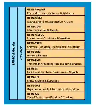 M&S面向消息的中间件(MOM)服务。这些服务使M&S和CTE应用程序和服务以及培训系统具有互操作性。面向消息的中间件服务符合NATO STANAG 4603和NATO标准AMSP-04。NATO STANAG 4603规定使用IEEE 1516™-2010 (HLA Evolved)标准,用于分布式仿真环境的高层架构。AMSP-04(NETN)定义了一套(连贯的)HLA FOM模块,以及架构和设计指南,见图7。NETN的FOM模块旨在最大限度地提高仿真组件之间的重复使用和互操作性。