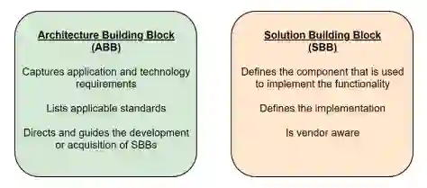架构模块(ABB)和架构模式(AP)这两个概念被用来描述RA中的模块以及这些模块如何被组合。这些概念在图3和图4中得到了说明,其中第一个图还显示了作为对比的概念--解决方案模块(SBB)。