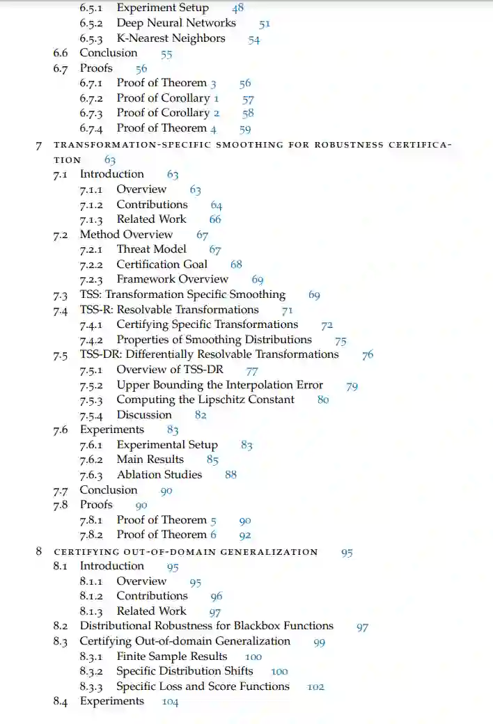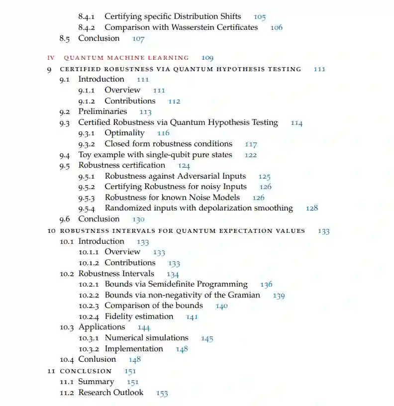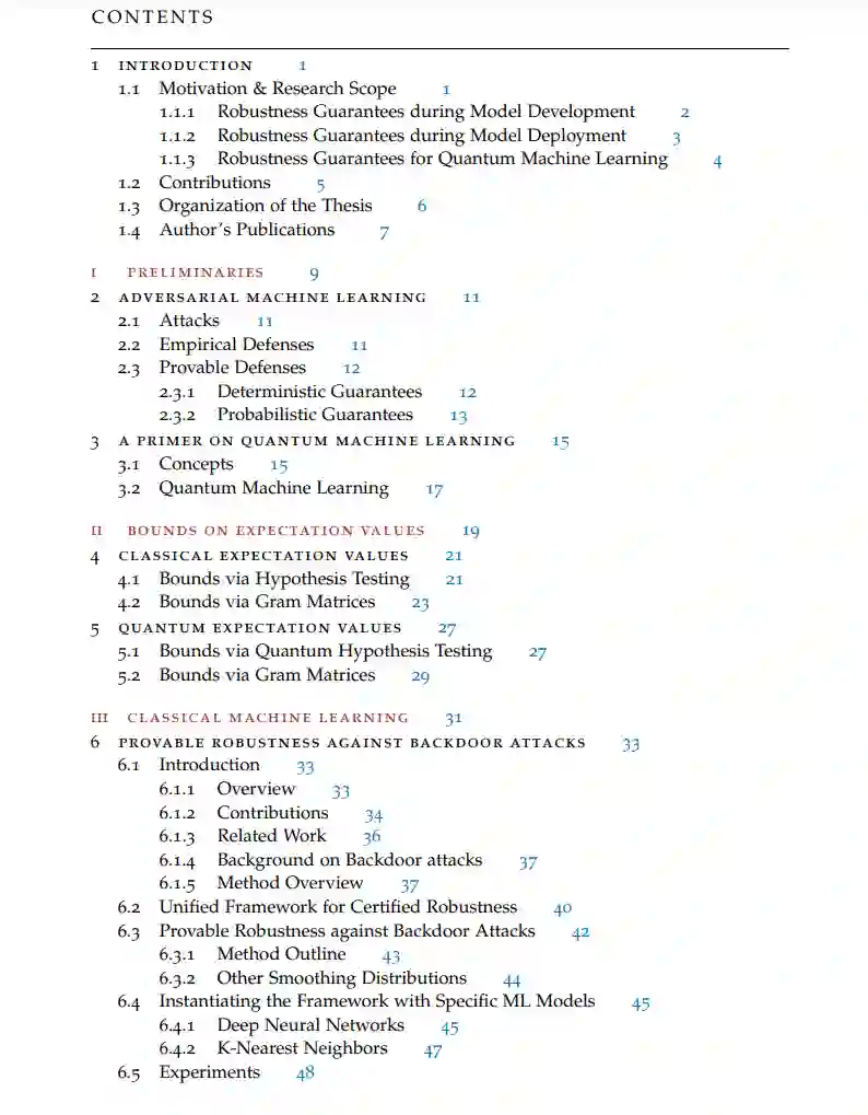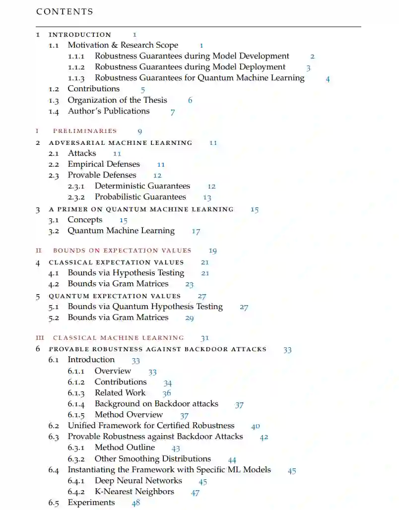 广泛采用的机器学习(ML)系统开启了一个前所未有的机遇时代,转变了行业、医疗保健和整个社会。然而,与这些机遇并存的是,ML面临着需要全面理解并充分解决的重大挑战。ML系统的内在复杂性使它们容易受到各个阶段的广泛对抗攻击和不确定性的影响。这些脆弱性源自ML系统运作的动态和不可预测的环境,其中输入数据的微小扰动可能导致灾难性的后果。此外,量子计算的出现及其最终整合到ML系统中引入了沿着新的维度的额外脆弱性。因此,开发能够保证ML系统韧性的方法学至关重要。这篇论文致力于开发概率鲁棒性保证,解决在ML流程的不同阶段出现的脆弱性问题,涵盖模型开发(包括训练和数据整理)和模型部署。此外,这些保证扩展到经典和量子计算框架,承认量子计算引入到ML领域的独特挑战和机遇。本论文的贡献有三方面:首先,我们关注模型开发阶段出现的对抗攻击,并开发了RAB,这是一个针对后门攻击(一种特定的数据投毒攻击)的可证明鲁棒的训练过程。我们的方法是基于从Neyman-Pearson引理衍生的概率鲁棒性保证的扩展,并基于对训练数据和测试实例进行平滑处理。除了这一扩展,我们还提出了针对特定模型类型所需的几项优化,使我们的方法能够有效应对常见的大规模数据集。除了方法的理论开发外,我们还在表格数据和计算机视觉数据集上展示了广泛的实验结果,并显示我们的鲁棒训练流程不仅提高了经验鲁棒性,而且提供了一个概率证书,保证了后门攻击已经失败。其次,我们将注意力转向模型部署阶段,并考虑来自语义转换以及数据分布变化的输入扰动。语义转换通常由低维参数空间(例如,旋转角度)控制,并在ℓp范数方面引起大量图像损坏。这使得传统的概率鲁棒性保证(提供对扰动幅度的界限)变得无效。为了解决这个问题,我们提出了TSS,一个针对来自语义扰动的输入损坏的鲁棒性认证框架。TSS利用Neyman-Pearson方法的随机平滑技术,并对变换参数进行平滑处理。结合新技术以限制插值误差和几种特定变换的认证方法,TSS为大量语义转换设定了新的最先进水平。与此工作线相对的,我们研究了ML系统对数据分布变化的鲁棒性,并与之前的结果相比,采取了基于人口的视角。我们在这里提出的保证不是针对特定实例的鲁棒性,而是通过界定训练分布周围的ϵ-球内任何分布上的最坏情况人口损失来呈现域外泛化的保证。与以前的方法不同,我们的方法只需要对模型函数的黑盒访问,因此可以扩展到大型模型,如EfficientNet-B7和BERT。在计算机视觉和自然语言基准测试上的多样化实验中,我们展示了我们的界限准确捕捉了由数据分布变化引起的最坏情况性能变化。第三,我们为量子ML开发了鲁棒性保证,我们覆盖了对抗案例和由自然噪声和退相干引起的输入损坏。为此,我们首先为量子分类器提出了一个鲁棒性保证,我们将Neyman-Pearson方法扩展到量子领域。有趣的是,由于从量子电路读出的固有概率性质,这一保证作为量子分类器的一般属性而存在,不需要像经典ML模型那样主动注入噪声进行平滑。最后,在噪声中等规模量子(NISQ)算法的开发阶段,自然噪声和退相干可能是比对抗场景更重要的障碍。作为最后一步,我们考虑了理想量子态的近似,其中近似误差可能来自噪声,或来自算法缺陷,如Ansätze的有限表达性。然后,我们扩展了基于量子假设测试(QHT)和格拉姆矩阵的非负性的技术,以导出量子期望值最坏情况误差的界限。在数值模拟中,我们研究了变分量子本征求解器(VQE),并在几个与量子化学相关的问题上验证了我们的界限。