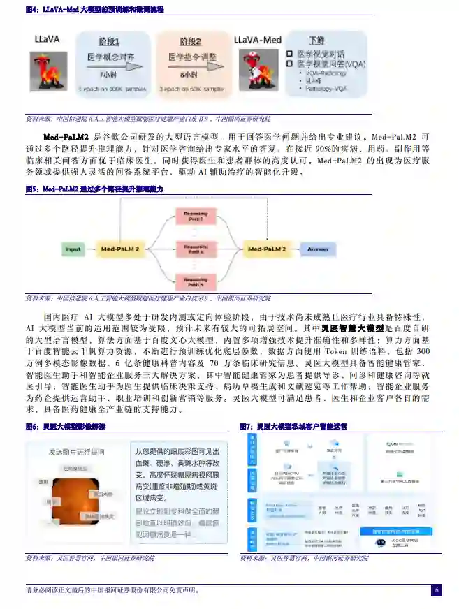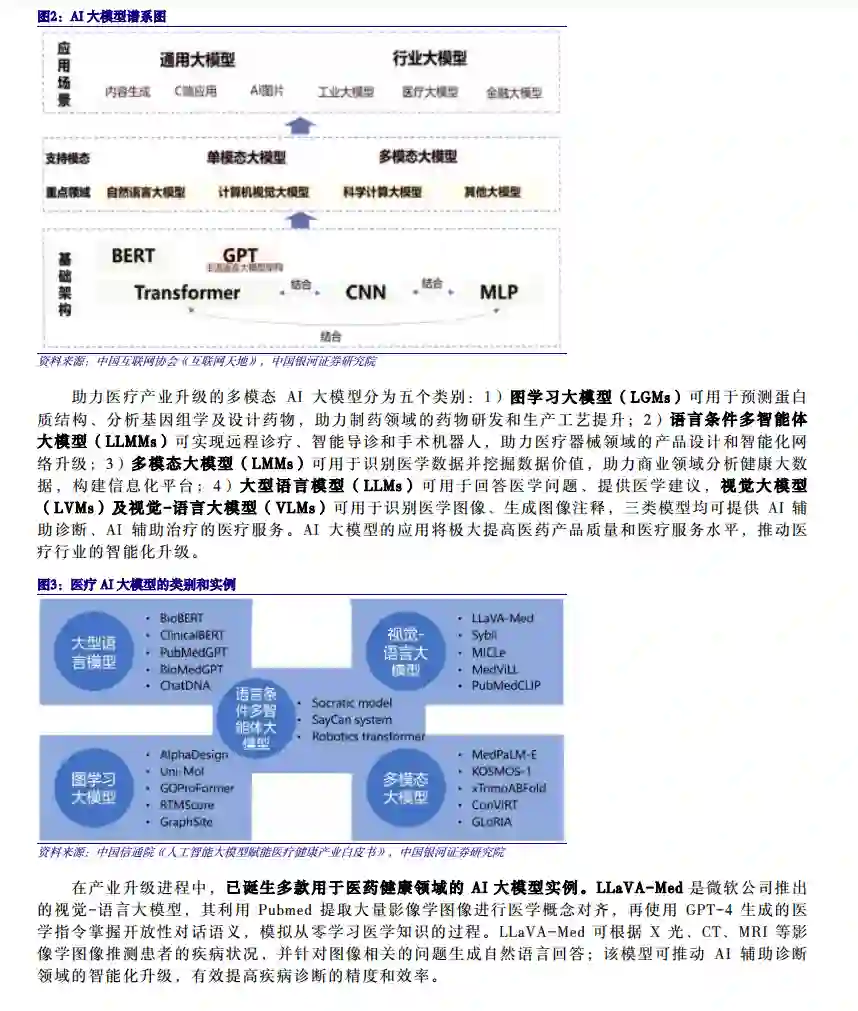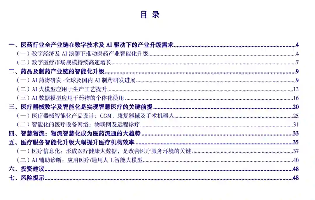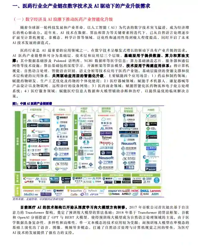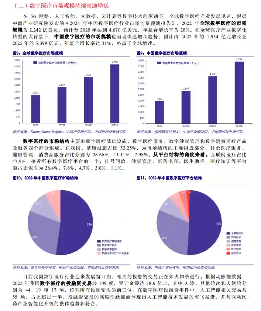 随着科技的不断进步,数字医疗和人工智能(AI)医疗已经成为推动全球医疗健康 产业发展的重要力量。数字医疗是指通过信息科技、智能科技与医疗的结合,形成 的医疗服务体系。这一体系涵盖了医疗设备系统、医院系统、区域卫生系统和健康 管理系统等多个方面,实现了医疗服务的信息化、网络化、移动化和智能化。根据 中商产业研究院发布的《2024 年中国数字医疗行业市场前景预测报告》,2022 年 全球数字医疗的市场规模为 2,242 亿美元,预计至 2025 年达到 4,670 亿美元,年复 合增长率为 28%。在全球医疗产业数字化转型的大背景下,中国数字医疗的市场规 模也呈现快速增长趋势,预计由 2022 年的 1,954 亿元增长至 2025 年的 5,399 亿 元,年复合增长率达 31%,略高于全球增速。 AI 医疗的发展为提高医疗服务质量、降低成本和提升患者体验带来了新的可能 性。人工智能与数字技术主要赋能四个应用场景: 1)药品和制药领域:赋能药物研发、生产工艺优化及药物的个体化使用等;研发 端,AI 新药设计能大幅缩减新药研发周期、降低成本、提升成药性, 2023 年全球共 有 43 家企业、102 条 AI 设计的药物成功进入临床阶段;生产端,AI 大模型用于制 药工业的工艺升级已逐渐开始;应用端,基于大数据模型、并结合患者的个体特征 和治疗目标,制订最佳的个体化给药方案也已开始应用。 2)医疗器械领域:手术机器人、智能康复器械、医疗设备物联网、远程诊疗等; 基于医疗影像大数据的辅助手术机器人的应用使得外科医生在手术操控性、准确度 和临床疗效上大幅提升;智能康复器械为康复人群提供更有效率的康复护理方案, 并节约康复医师人力;医疗装备的物联网化、智能化,为医院管理提供智慧化的解 决方案;远程诊疗则大幅提升优质医疗资源的辐射半径,提高医生的诊疗效率。 3)医药商业领域:智能化医药物流和电子处方处理系统;先进的智能化现代物流 配送体系和电子处方处方系统等开始在国内快速应用,持续提升药品的可及性和安 全性,为全产业链提升运营效率。 4)医疗服务领域:医疗信息大数据、大模型辅助诊断和治疗。医疗信息化在国内 持续推进,基于数字化及智能化的电子病历可以为医生工作大幅提升效率,同时 AI 诊断在国内高速成长,基于大数据和大模型的智能化诊疗方案,可以为临床医 生提供最优的临床解决方案。