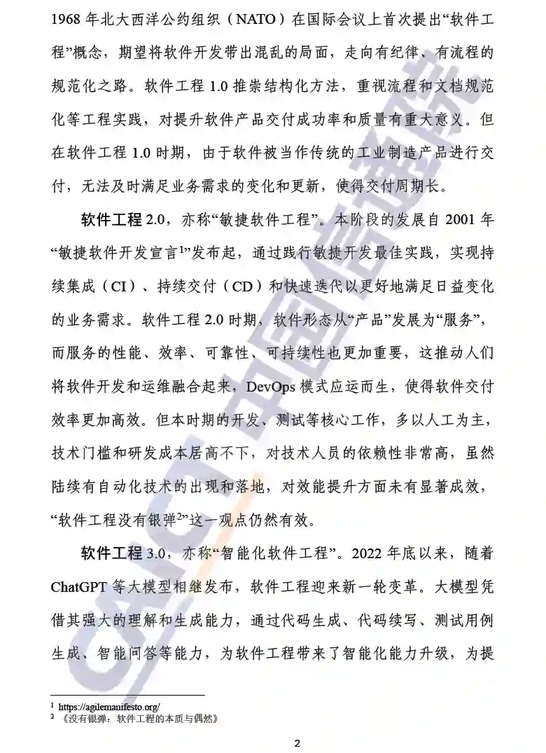 2024年《政府工作报告》首次提出“人工智能+”战略行动,旨在推动人工智能赋能各行各业。以大模型为代表的新一代人工智能技术迅猛发展,已成为软件工程领域智能化转型的关键驱动力,为软件开发、测试等环节注入新智力。智能化软件开发工具凭借其强大的代码理解和生成能力,有效降低了开发人员的技术门槛,并提高开发效率和质量,进一步推动软件开发领域的进步。 然而,在软件开发的智能化能力建设和应用过程中,仍面临诸多挑战,如代码大模型选择困难、开发工具的工程化建设复杂、智能化能力建设无参考、开发场景选择和落地难,以及与现有开发工具或流水线的集成难等问题。为此,本指南旨在为正在进行软件开发智能化转型的企业提供一份实用指南,为企业制定落地策略、建设智能开发能力体系提供有力参考。本指南系统梳理了智能化软件开发的发展历程、现状和面临的挑战,结合大模型和软件开发特点,提出了具体的落地方向、路径和框架,详细阐述了落地所需的核心能力和使能能力,并对多个行业的落地案例进行了深入剖析,最后对智能化软件开发的发展趋势进行了展望。 由于大模型等人工智能技术产业仍处于快速发展阶段,智能开发相关的技术产品、服务和应用也在不断演变,我们的认识将随着产业实践而不断深化,报告存在的不足之处,恳请大家批评指正。 智能开发发展概述 随着人工智能技术的不断进步,特别是大模型能力的持续提升,软件工程领域正迎来前所未有的变革,软件开发的流程和模式正被重新定义,智能化进程显著加速。本章将简要回顾软件工程的发展历程,重点介绍软件工程3.0的发展特点,以及智能化软件开发(以下简称:智能开发)领域发展现状,并深入探讨智能化能力为软件开发带来的价值提升,最后梳理落地挑战。 软件工程步入3.0时代 软件工程发展历程 软件工程自1968年诞生以来,其发展历程可分成三个阶段,包括软件工程1.0、软件工程2.0和软件工程3.0。