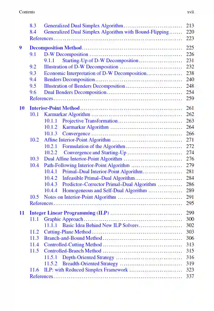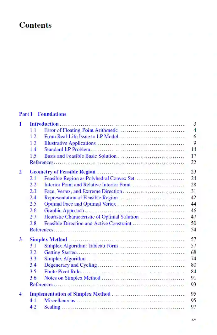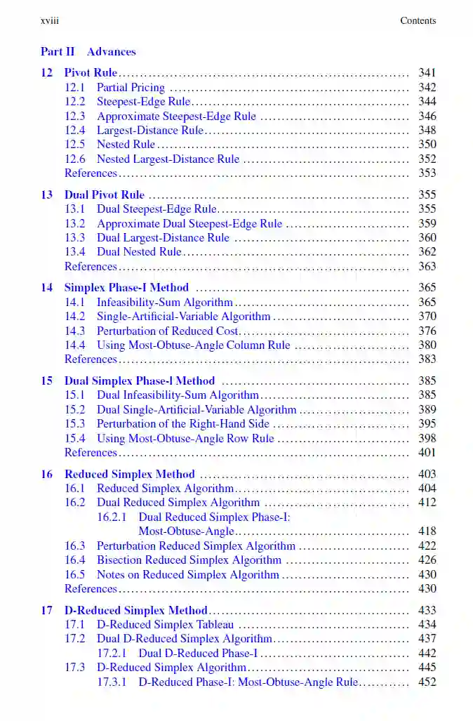 在第二卷中,“单纯形可行点算法”被重写,并从“关键内点法”一章中删去,改为“单纯形内点法”一章,它代表了由传统单纯形算法转化而来的一类高效内点算法。由于剩余的算法代表了由普通内点算法转化而来的另一类高效内点算法,因此原章的标题被改为“人脸内点方法”。在不利用稀疏性的情况下,使用Cholesky分解实现原始/双重人脸方法。为了处理稀疏计算,在第二卷中增加了两个讨论LU因子分解的章节。最令人兴奋的改进来自对简化单纯形法的重新发现。在第一版中,原型的推导是在一个标题相同的章节中介绍的,然后在另一章中转换为所谓的“改进”版本。幸运的是,作者最近找到了一个相当简洁的新推导,所以他现在可以在一章中介绍独特的fresh单纯形方法。令人兴奋的是,简化单纯形法有望成为有史以来最好的LP求解器。 以计算为重点,当前版本包含许多新颖的想法,理论和方法,由坚实的数值结果支持。它的内容简洁明了,从简单到深刻,呈现出一种新鲜的方式。特别是,大量的例子被用来演示算法。这本书是LP领域的稀有作品,是LP及其相关领域的本科生和研究生、教师、从业者和研究人员不可或缺的工具。