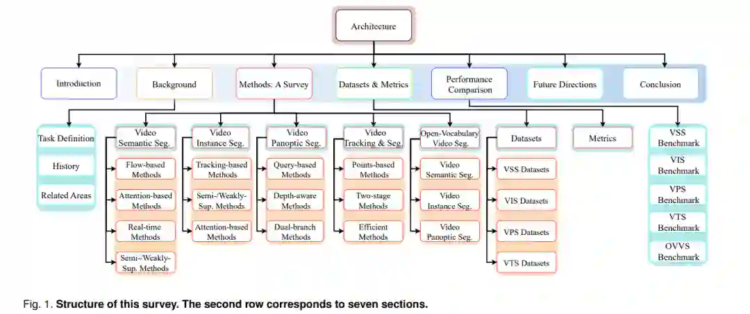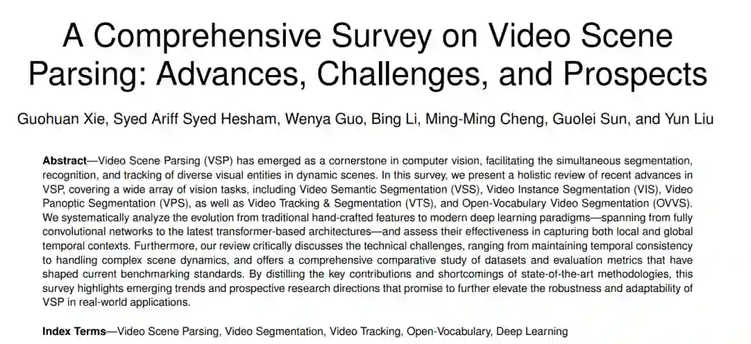 摘要—视频场景解析(Video Scene Parsing, VSP)已成为计算机视觉领域的核心任务之一,它促进了在动态场景中对多种视觉实体的同时分割、识别与跟踪。在本综述中,我们全面回顾了VSP的最新研究进展,涵盖了多个视觉任务,包括视频语义分割(Video Semantic Segmentation, VSS)、视频实例分割(Video Instance Segmentation, VIS)、视频全景分割(Video Panoptic Segmentation, VPS)、视频跟踪与分割(Video Tracking & Segmentation, VTS)以及开放词汇视频分割(Open-Vocabulary Video Segmentation, OVVS)。我们系统分析了该领域从传统手工特征到现代深度学习范式的发展过程——涵盖了从全卷积网络到最新的基于Transformer的架构,并评估了它们在建模局部与全局时序上下文方面的有效性。此外,我们还深入探讨了该领域所面临的技术挑战,包括时序一致性的保持以及复杂场景动态的处理等,并对构建当前基准测试标准所依赖的数据集与评估指标进行了全面的对比分析。通过提炼当前先进方法的关键贡献与不足,本综述进一步指出了该领域的新兴趋势与潜在研究方向,有望在实际应用中进一步提升VSP方法的鲁棒性与适应性。 关键词—视频场景解析,视频分割,视频跟踪,开放词汇,深度学习
