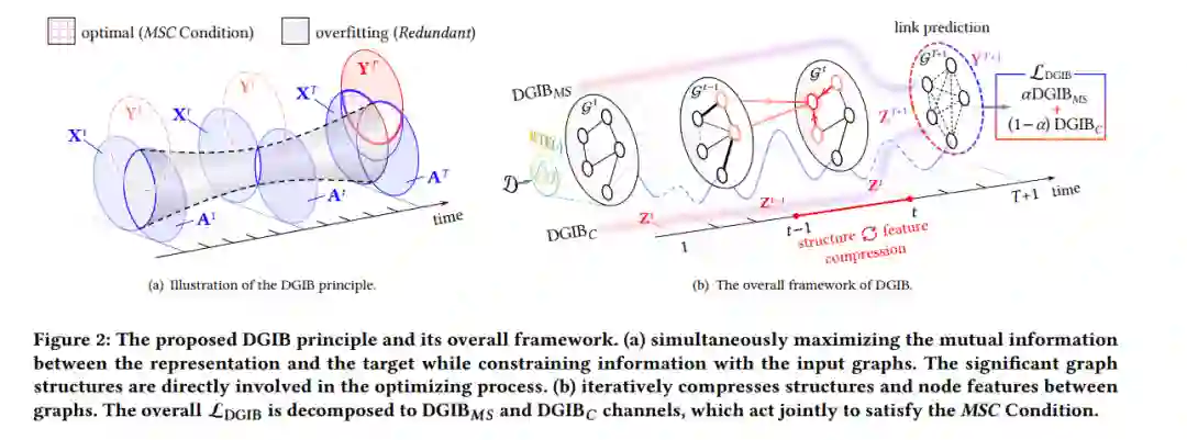 动态图在现实世界中广泛存在,它们承载着复杂的空间和时间特征模式,给它们的表示学习带来挑战。动态图神经网络(DGNNs)通过利用内在动态展现了令人印象深刻的预测能力。然而,DGNNs表现出有限的鲁棒性,容易受到对抗攻击的影响。本文提出了一种新颖的动态图信息瓶颈(DGIB)框架,以学习鲁棒且具有辨别性的表示。通过利用信息瓶颈(IB)原理,我们首先提出期望的最优表示应满足最小-充分-共识(MSC)条件。为了压缩冗余信息同时保留有价值的信息到潜在表示中,DGIB迭代地指导和精炼通过图快照传递的结构和特征信息流。为了满足MSC条件,我们将整体的IB目标分解为DGIB𝑀𝑆和DGIB𝐶,其中DGIB𝑀𝑆通道旨在学习最小且充分的表示,而DGIB𝐶通道保证了预测共识。在真实世界和合成动态图数据集上的广泛实验表明,与链接预测任务中的最新基线相比,DGIB在抵抗对抗攻击方面表现出更优的鲁棒性。据我们所知,DGIB是第一个基于信息论IB原理学习动态图鲁棒表示的工作。