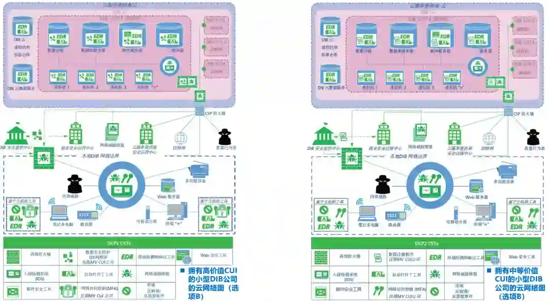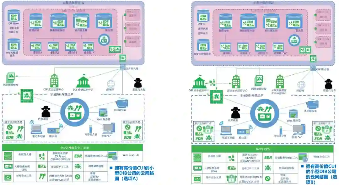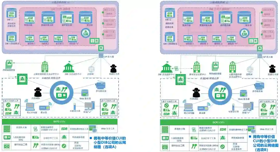 图7-大型公司(选项A):本地网络 vs. 云网络上面左、右两图的安全能力几乎是相同的,其主要差异在于是否上云。而上云情况下主要是由云服务提供商(CSP)提供对DIB公司云中飞地(其中包含邮件、门户网站等)的安全防护。 3.2)小型DIB公司场景