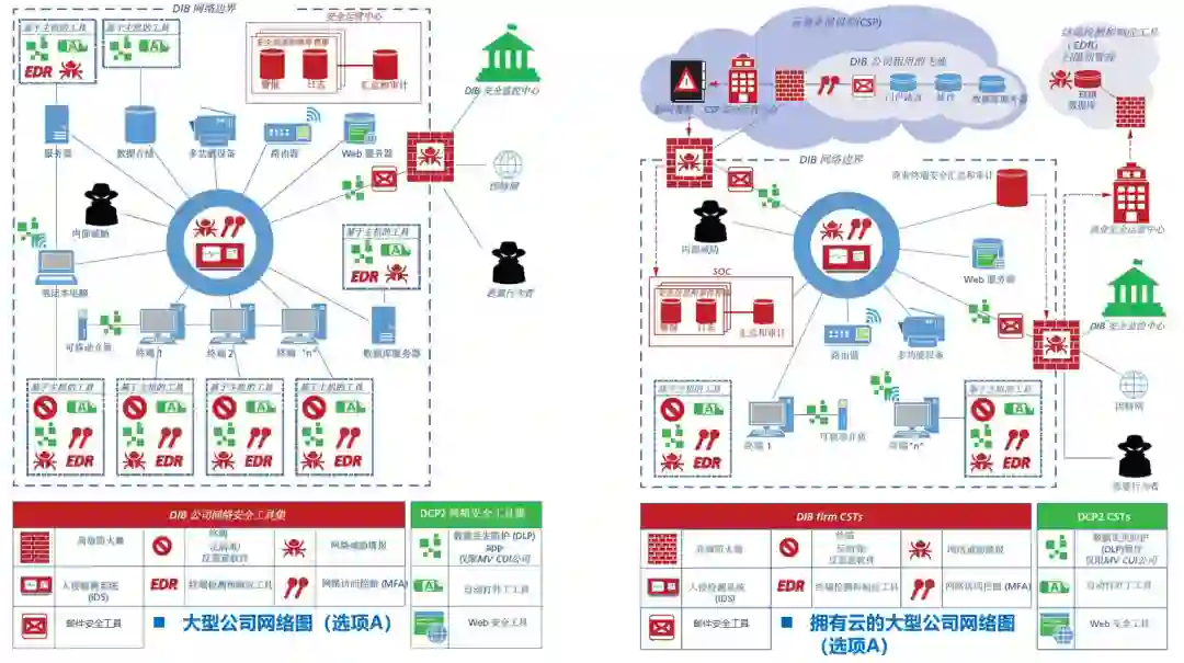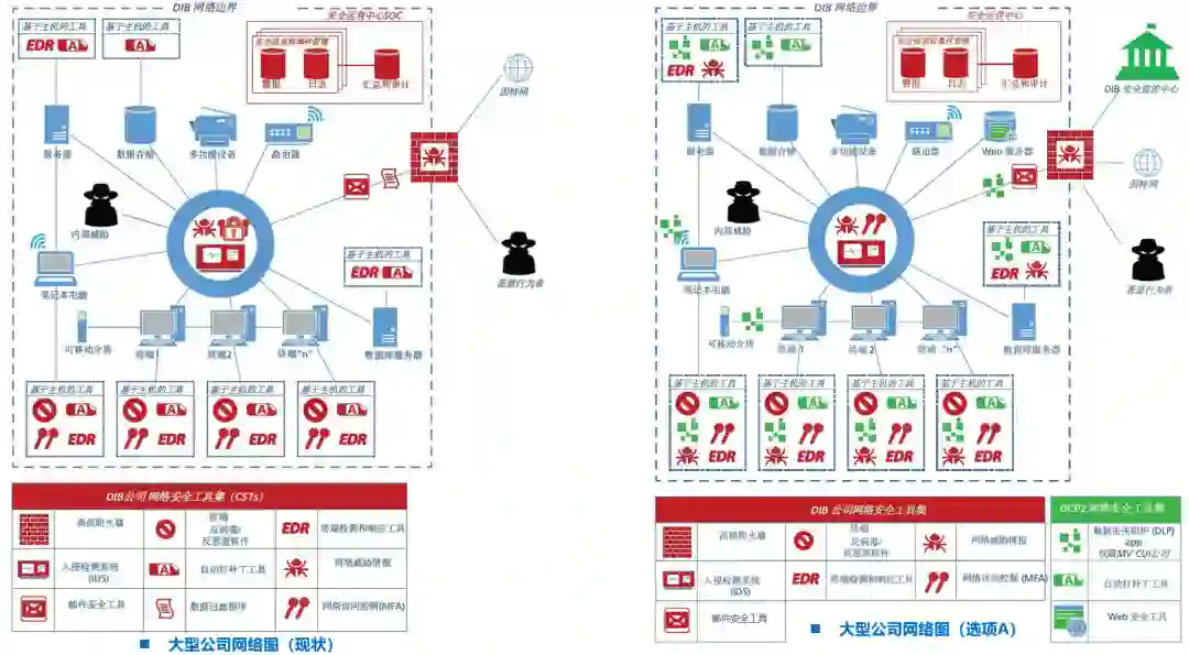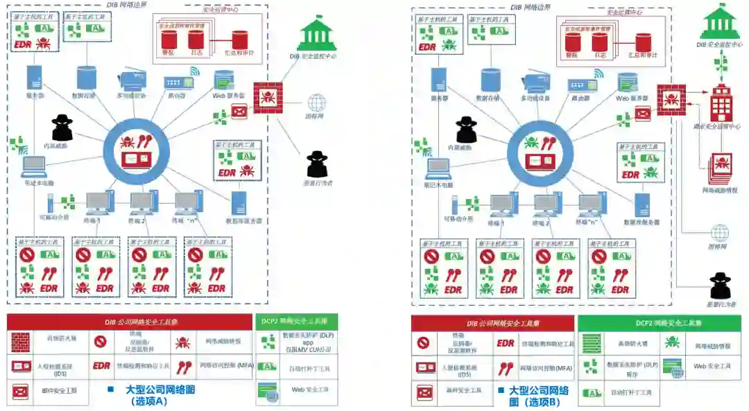 图5-大型公司网络:现状 vs. 选项A对于大型公司而言,由于大型公司通常已经自建了大部分的安全能力(见左图,以红色标记),故通过DCP2提供的安全能力(以绿色标记)并不多,主要是DLP、自动补丁、Web安全工具等(见右图,以绿色标记)。右图(选项A)中,还连接到国防部领导的DIB安全运营中心。