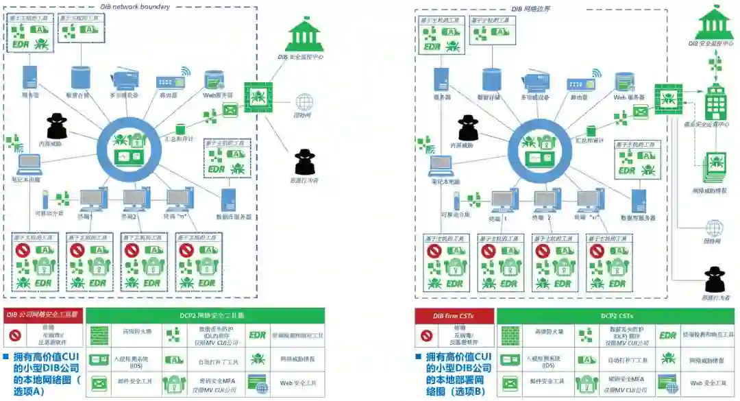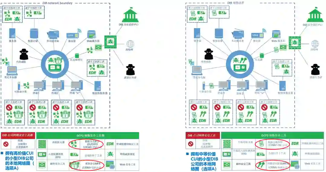 图8-小型DIB公司的本地网络(选项A):拥有高价值CUI vs. 中等价值CUI如图所示,由红色标记的DIB公司自购的网络安全工具非常少,这是现状;而绿色标记的DCP2网络安全工具就非常多,极大补充了DIB小型公司的安全能力。这也正是国防工业基础网络保护计划(DCP2)的目的所在。前面提到,大多数DIB小型公司,通常缺少安全运营中心(SOC)和内部SIEM能力。而通过参与国防工业基础网络保护计划(DCP2),DIB小型公司将可以由一个集中式的DIB安全运营中心(SOC)提供SIEM功能,从而具备了一些要求最高、劳动力最密集的网络安全功能:如威胁分析、数据关联、数据汇总、警报分类。上面左、右两图的主要区别在于:在访问控制方面,右侧的中价值公司采用了常见的网络访问控制(MFA),而左侧的高价值公司则采用了密码安全MFA,提高了安全标准;此外,在数据安全方面,右侧的中价值公司采用了数据过滤程序,而左侧的高价值公司则采用了DLP(数据防泄漏),也提高了安全标准。