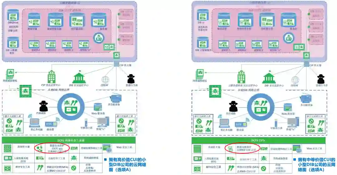 图9-小型DIB公司的云网络(选项A):拥有高价值CUI vs. 中等价值CUI该图的最大特色是,红色的自购安全控制全部消失,表明所有安全控制皆由DCP2计划提供(绿色标记)。上面左、右两图的主要区别在于:右侧的中价值公司采用了数据过滤程序;而左侧的高价值公司则采用了DLP(数据防泄漏),提高了安全标准。 对于后面的各种场景图,请自行对比,不再赘述: