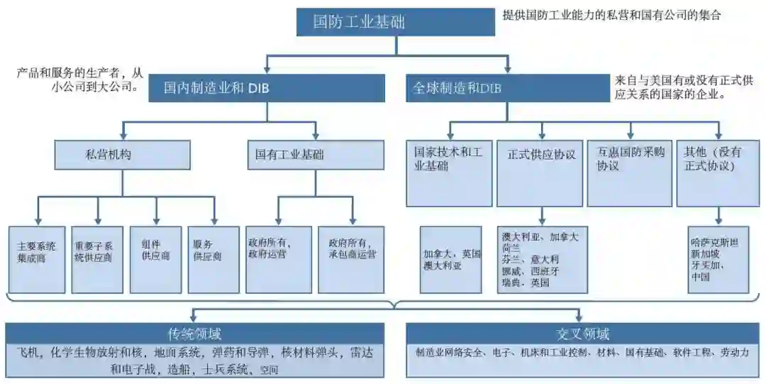 1)什么是国防工业基础****国防工业基础(DIB)是一组提供国防工业能力的私营和公有公司(从小公司到大公司)。国防工业能力是“设计、开发、制造、维修、保障国防部产品及其必要子系统和组件所需的技能和知识、流程、设施、设备”。国防工业基础(DIB)有两个组成部分: