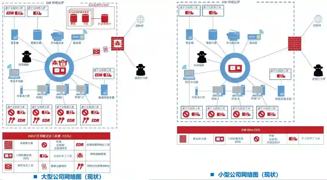图4-国防工业基础(DIB)现状:大型公司 vs. 小型公司通过该图明显可见,总体来看,大型公司通常使用更多、功能更强的网络安全工具集(CST);而小型公司使用更少的功能更弱的工具,比如缺少SOC、自动补丁、威胁情报、邮件安全、数据过滤、网络访问控制、EDR等安全能力。特别是,大多数DIB小型公司,通常缺少安全运营中心(SOC)和内部安全信息和事件管理(SIEM)能力,因此难以有效应对复杂网络攻击或高级持续性威胁(APT)的挑战。