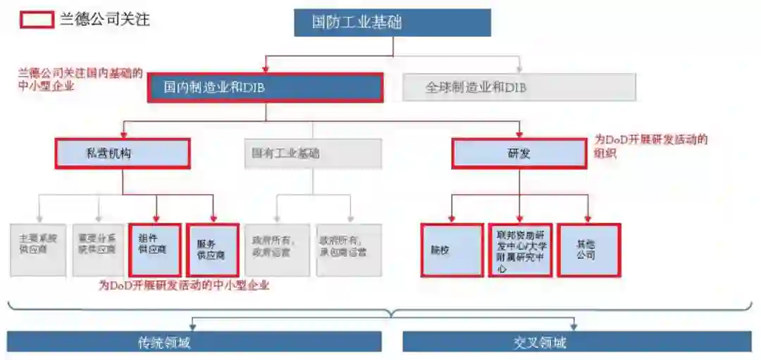 **图2-本文的研究对象(由红色框标记)**图中红色框表示兰德报告的研究重点。在国内基础中,兰德报告的私营机构关注重点是为国防部进行研究的中小型技术行业公司。在兰德报告的研究中,国防工业基础(DIB)的小型公司是年收入在 1 亿美元以下的公司,中型公司是年收入在 1 亿美元到 5 亿美元之间的公司,而大型公司是年收入在 5 亿美元以上的公司。以下是 2018 财年的一些例子: