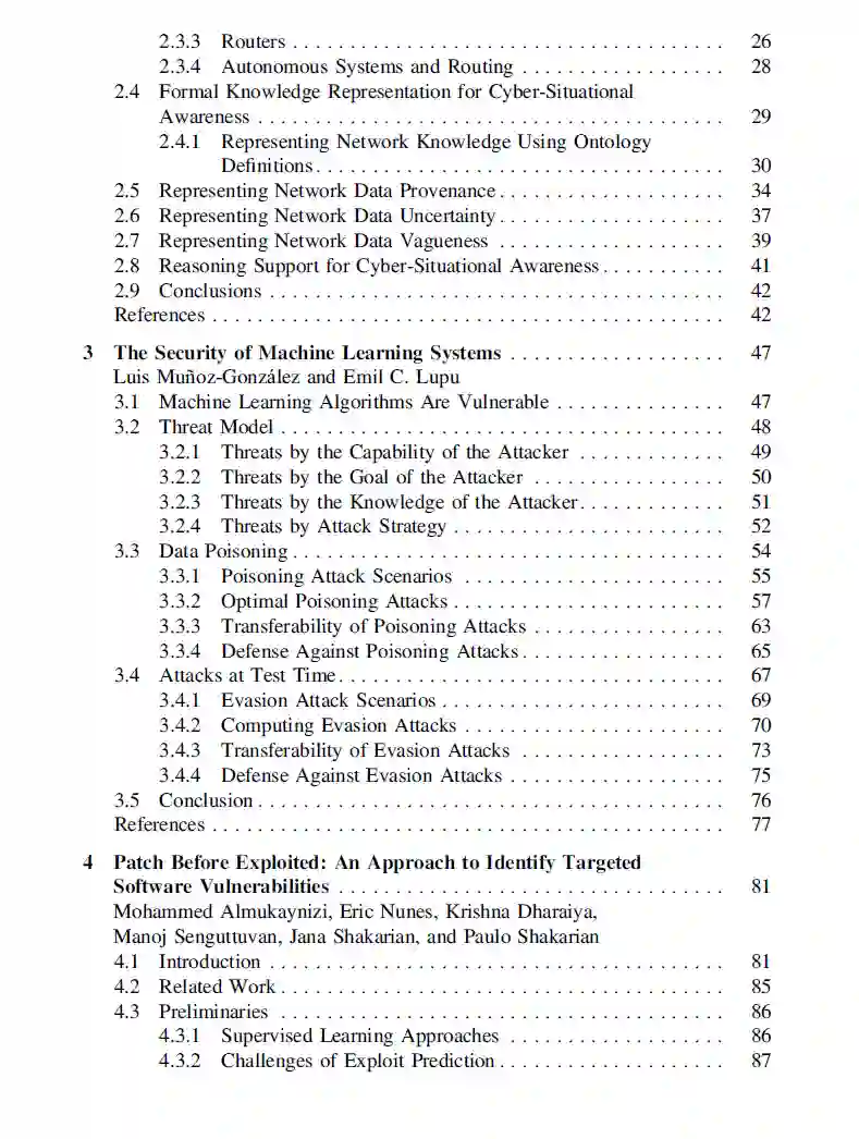 尽管如此,还是有一些有希望的途径:复杂行为匹配可以根据所采取的行动隔离威胁,而机器学习可以帮助检测异常,防止恶意软件感染,发现非法活动的迹象,并保护资产免受黑客的攻击。反过来,知识表示使网络数据的自动推理成为可能,有助于实现网络态势感知。本书汇集了高水平专家的贡献,在这个关键和快速发展的领域提出了新的研究方向。