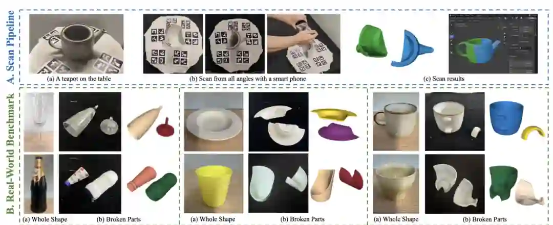 **家具拼装:**关注功能性部件的组合,例如拼接椅腿和扶手来完成椅子的构建,强调各部件在整体结构中的功能角色。这类任务中,部件往往具有规则、可重复的几何结构,装配步骤相对明确。 * **几何拼装:**则关注如何将形状各异、功能未知的物体碎片还原为完整形状,例如修复摔碎的碗、拼接考古遗址中的陶片、或工业中不规则零件的对接。这类任务不依赖预定义结构,更强调对局部几何关系的理解与操作的灵活性。