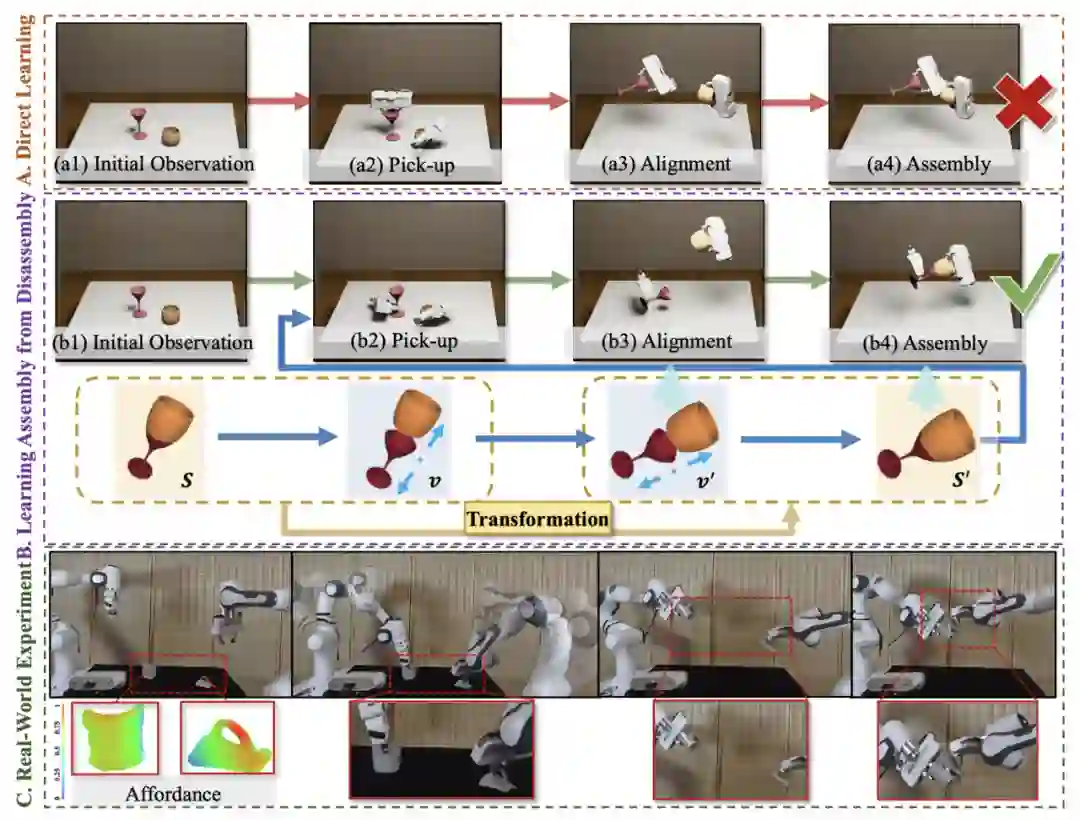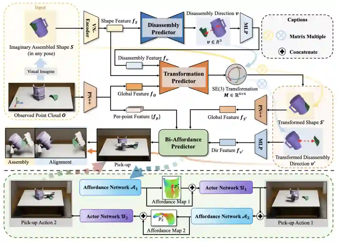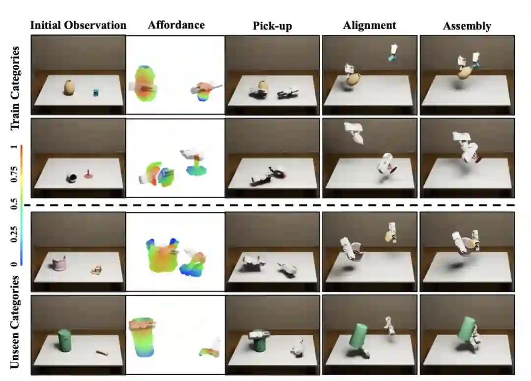 **拼合步骤:**模型预测不会导致部件碰撞的安全拼合方向; * **对齐步骤:**将目标装配状态变换为从当前初始姿态出发、机械臂可达且无碰撞的中间姿态; * **拾取步骤:**模型学习具备协同性的点级可供性(point-level affordance)感知,不仅判断抓取点是否稳定,还预测其是否利于后续拼装动作的顺利执行。