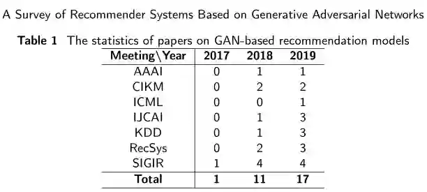GANs在其他领域的成功应用为RS树立了良好的榜样,一些开创性的工作已经在这一领域迈出了第一步[82]。根据近三年与RS相关的顶级会议的统计,基于GAN的推荐模型的论文数量逐年增加,如表1所示。在2018年基于GANs的信息检索(IR)模型研讨会上, 研究人员[95]指出基于GAN的RS将成为一个热点领域的RS。原因在于,GANs的想法带来了新的机会抵抗噪声数据的干扰和缓解数据稀疏。在现有的基于GAN的RS中,为了减少RS对数据的干扰,一些研究人员验证了加入对抗扰动的有效性,并在目标函数中引入极小极大对策来减少数据噪声。与此同时,其他研究人员试图使用鉴别器以一种对抗性的方式从未观察到的例子中区分出信息更丰富的样本。为了缓解数据稀疏性问题,现有的基于GANs的推荐模型不仅可以通过增加user-item交互信息直接生成用户偏好,还可以通过增加辅助信息合成用户偏好,可以显著降低数据稀疏性。