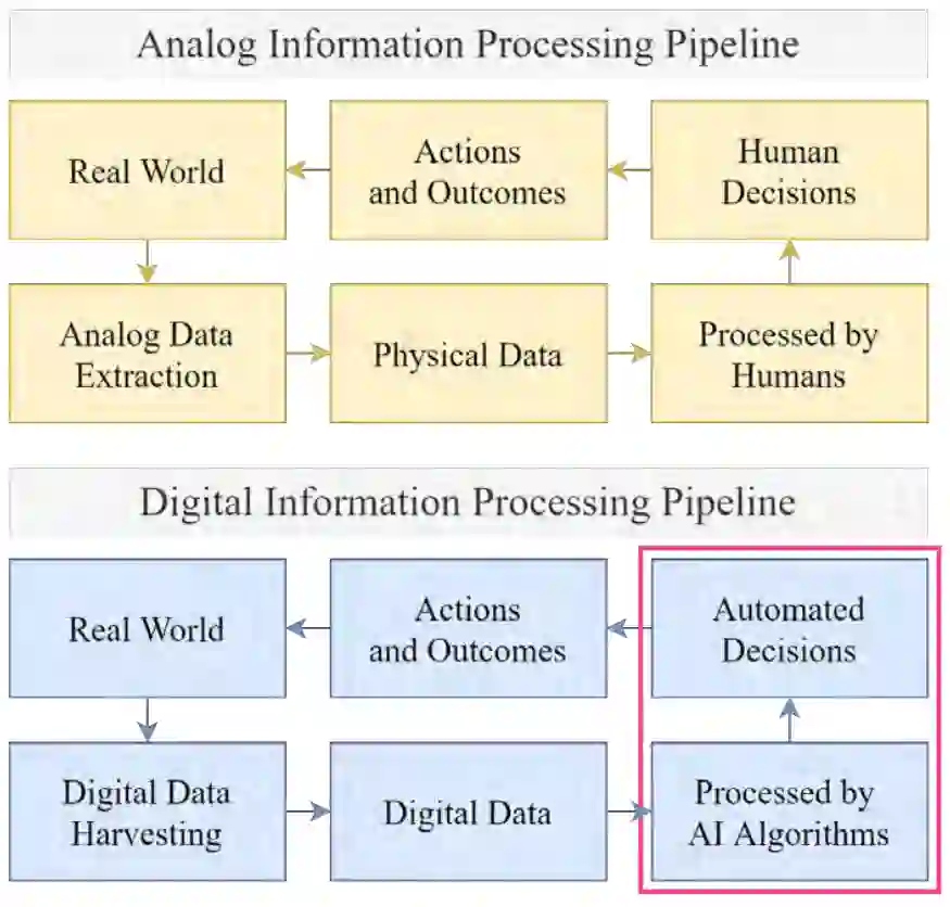 图 1.1: 日常行为和互动如何通过信息处理管道传播,并最终在现实世界中以有形结果的形式反馈给我们的简化视图。该图将模拟管道与数字管道进行了比较。主要区别在于,我们正越来越多地将决策能力交给人工智能算法。围绕着两个数字阶段的粉色矩形轮廓表明了本论文在这一管道中的位置和重点。